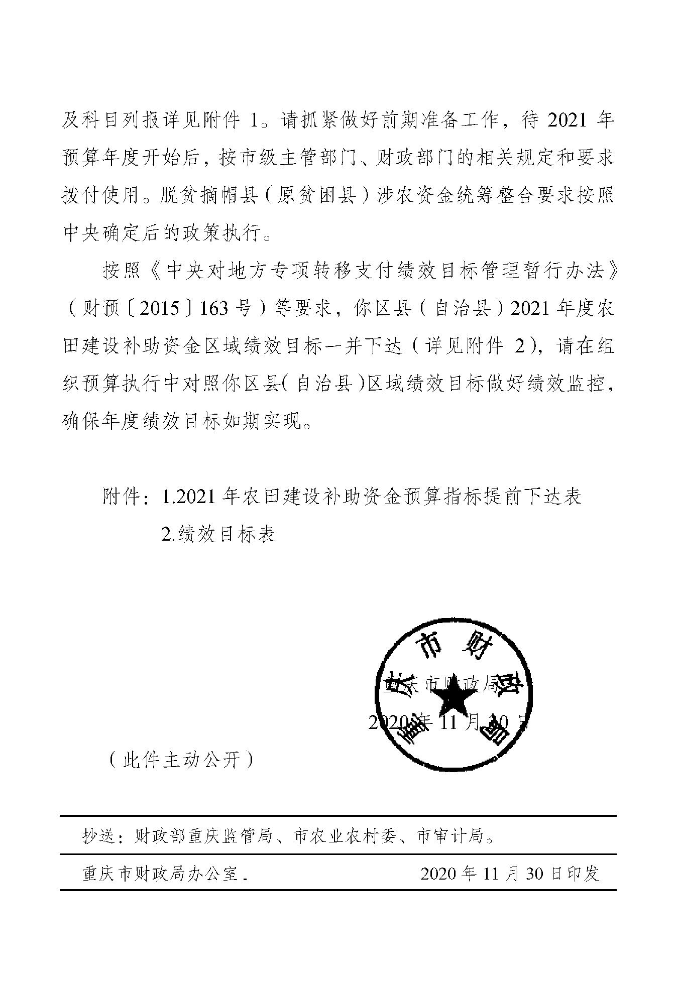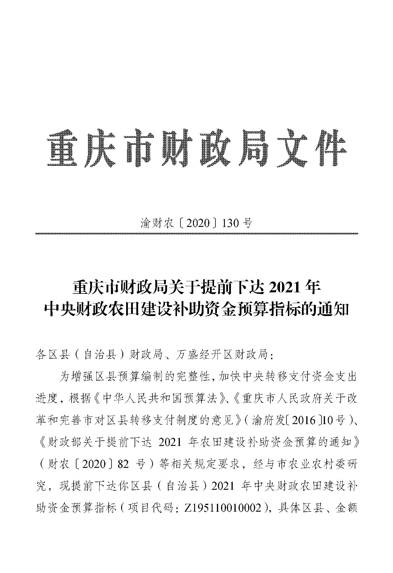 重庆市财政局关于提前下达2021年中央财政农田建设补助资金预算指标的通知