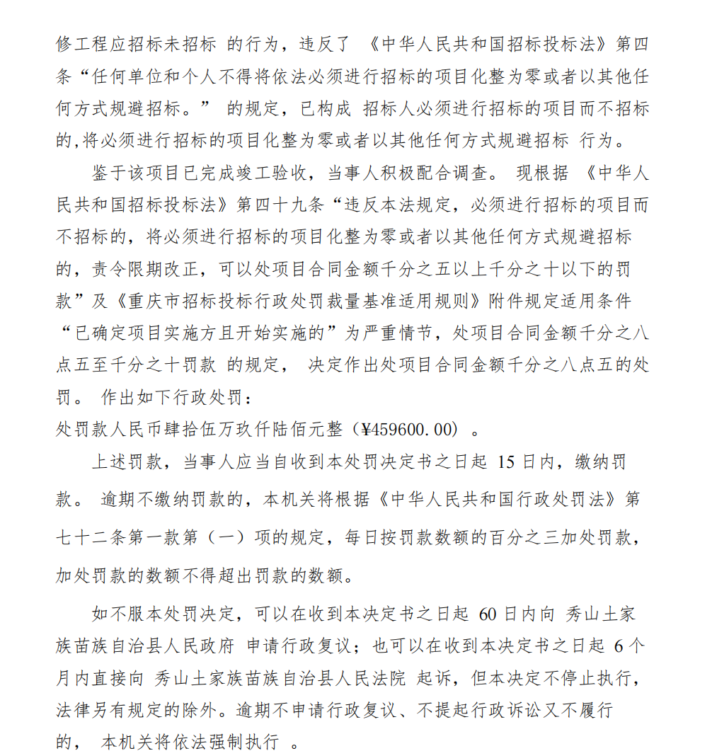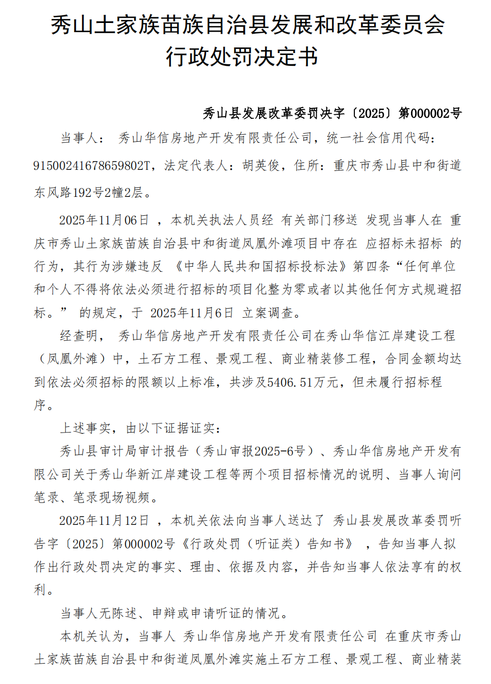 秀山土家族苗族自治县发展和改革委员会关于对秀山县华信房地产开发有限责任公司的行政处罚决定书