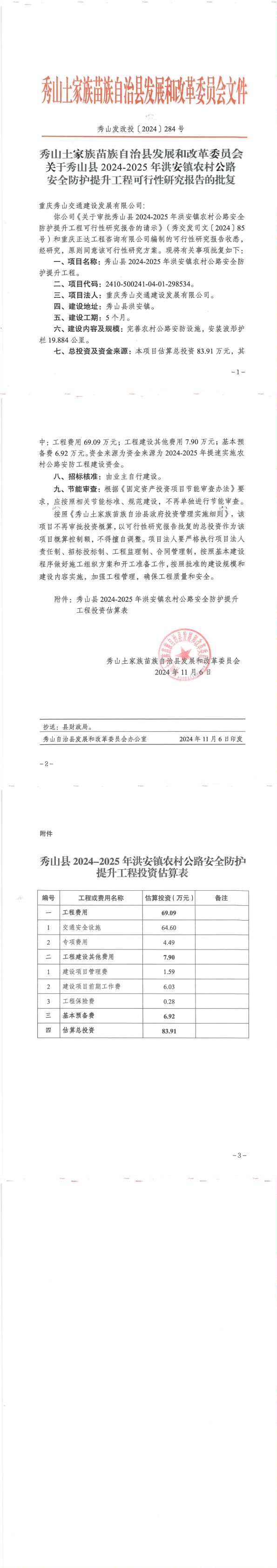 关于秀山县2024-2025年洪安镇农村公路安全防护提升工程可行性研究报告的批复