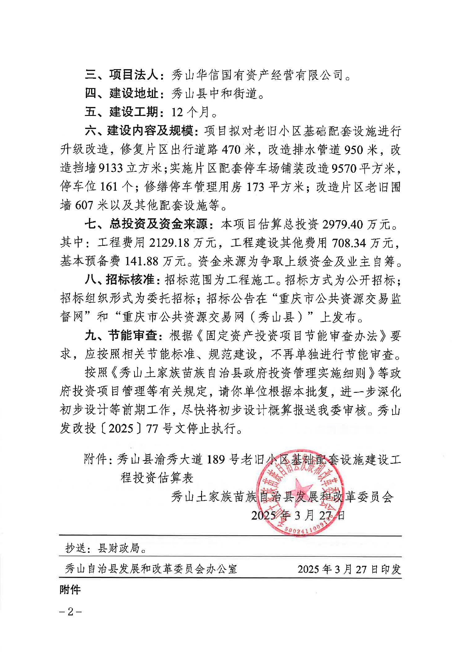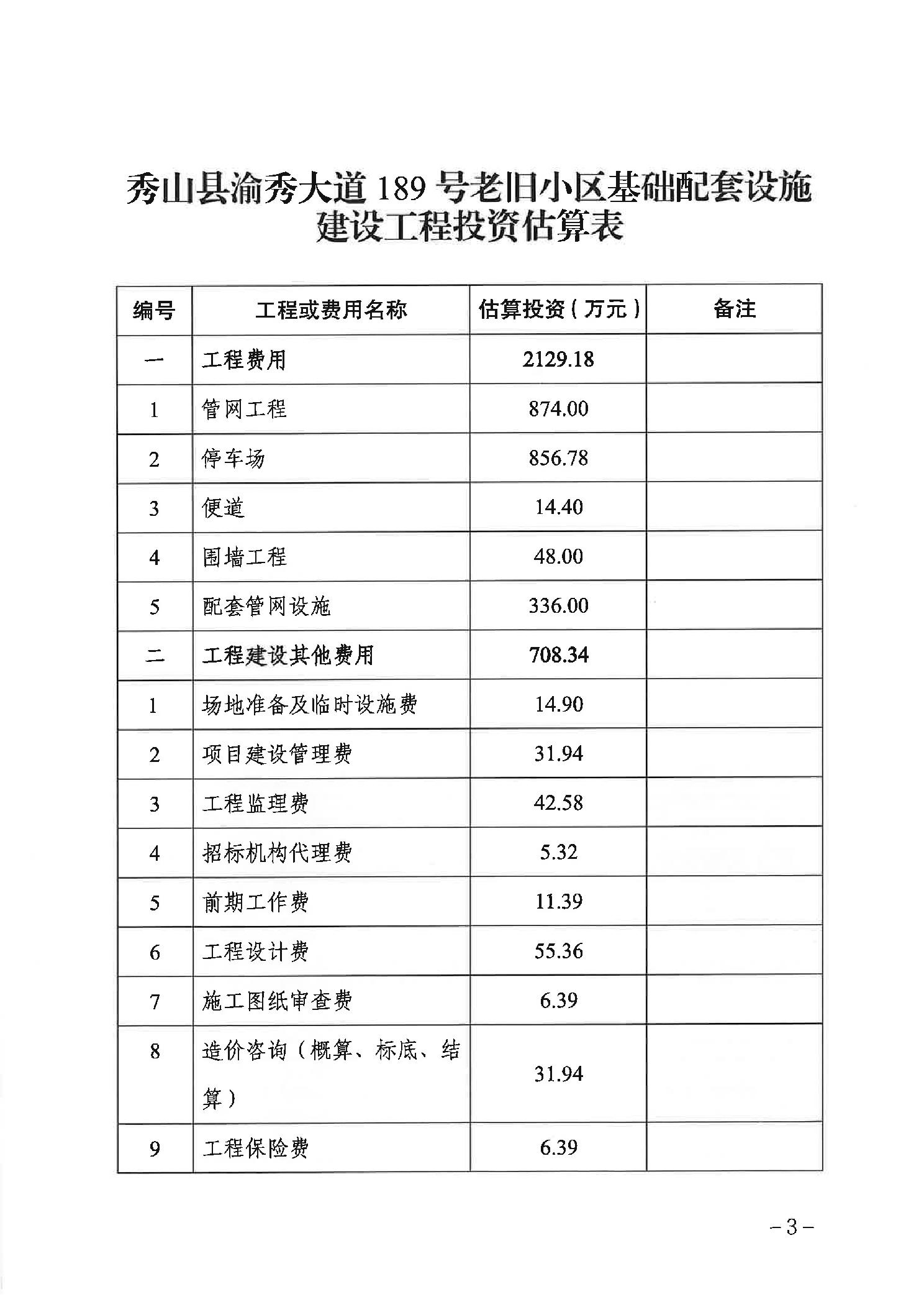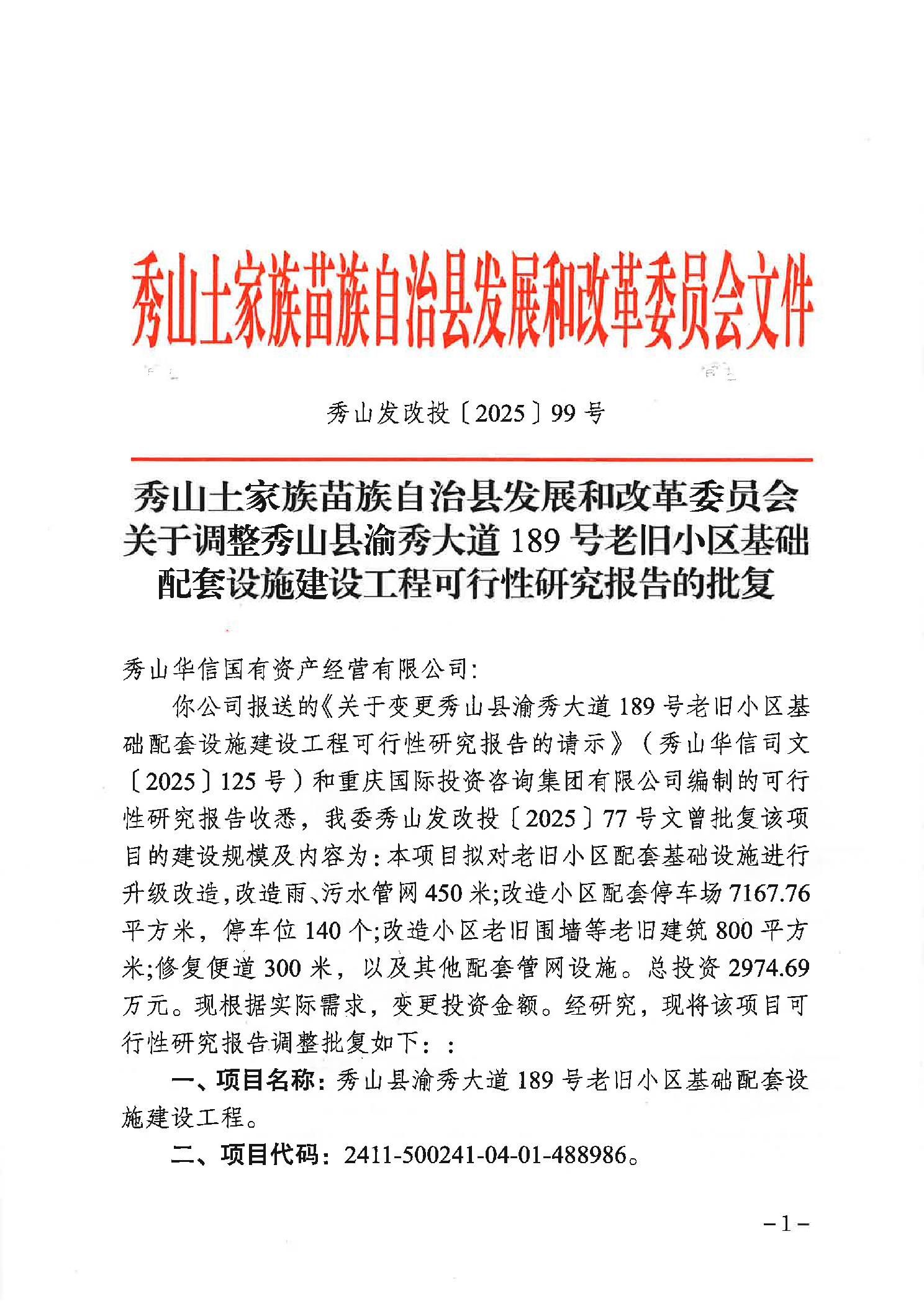 关于调整秀山县渝秀大道189号老旧小区配套基础设施建设工程可行性研究报告的批复