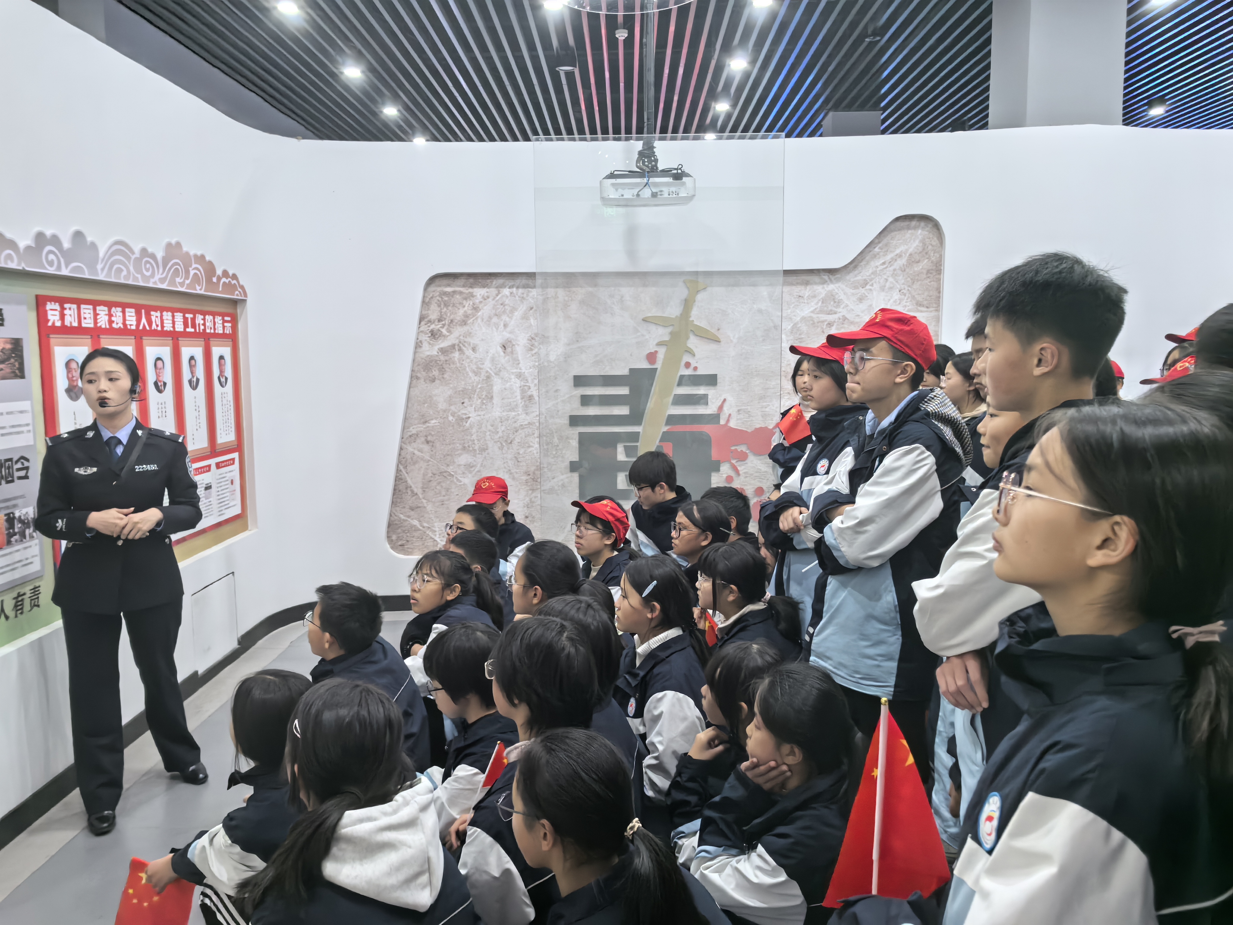 活动中,禁毒基地讲解员带领师生依次参观了禁毒历史、毒品认知、危害警示、防毒技巧等展区。通过实物展示、图文讲解、VR体验、案例剖析等多种形式,用通俗易懂的语言详细介绍了传统毒品、合成毒品及新型毒品种类,深入讲解毒品对个人身心健康、家庭幸福和社会安定的严重危害。