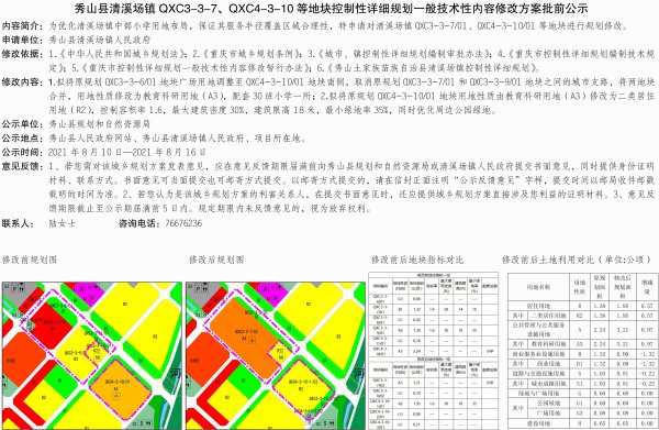 秀山县清溪场镇QXC3-3-7、QXC4-3-10等地块控制性详细规划一般技术性内容修改方案批前公示