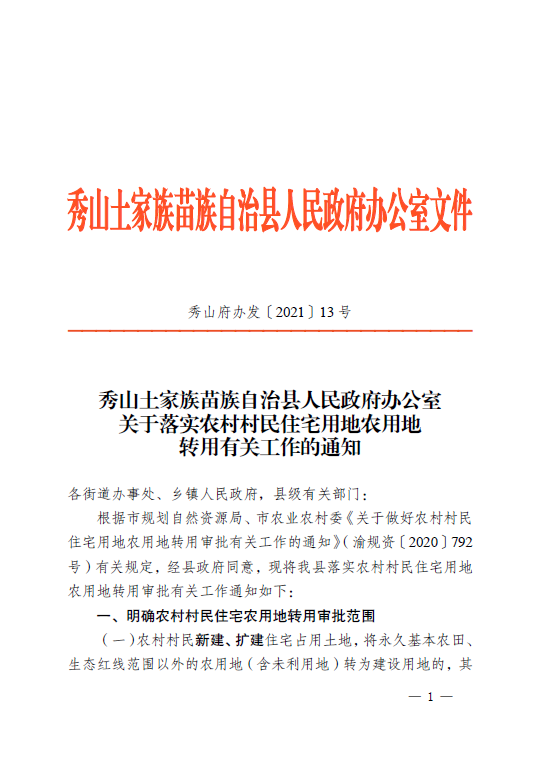 秀山土家族苗族自治县人民政府办公室关于落实农村村民住宅用地农用地转用有关工作的通知