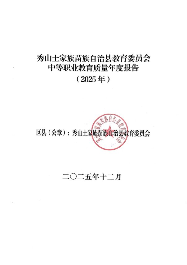 为全面贯彻党和国家的教育方针,落实立德树人根本任务,主动对接《国家职业教育改革实施方案》等文件精神及重庆市关于深化现代职业教育体系建设改革的系列部署,系统总结秀山土家族苗族自治县中等职业教育在2025年度的办学实践与发展成效,回应社会关切,接受公众监督,持续提升人才培养质量与学校治理水平,特编制《秀山土家族苗族自治县教育委员会中等职业教育质量年度报告(2025年)》。