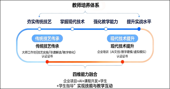二是构建“双轨四维”培养体系,设立传统技艺传承与现代技术提升双轨道,围绕技艺、技术、教学与实战四个维度系统提升教师能力。
