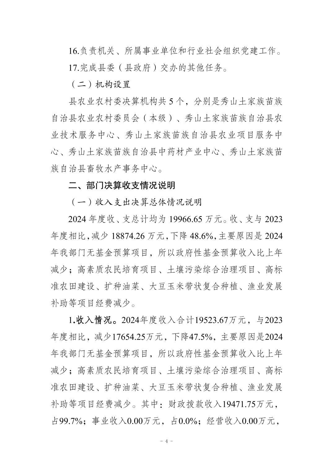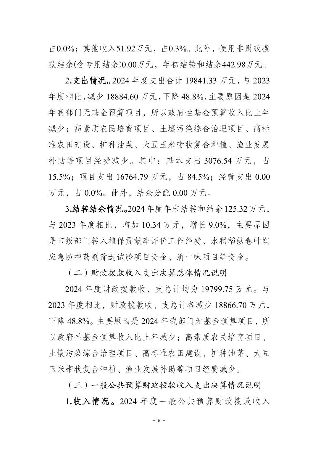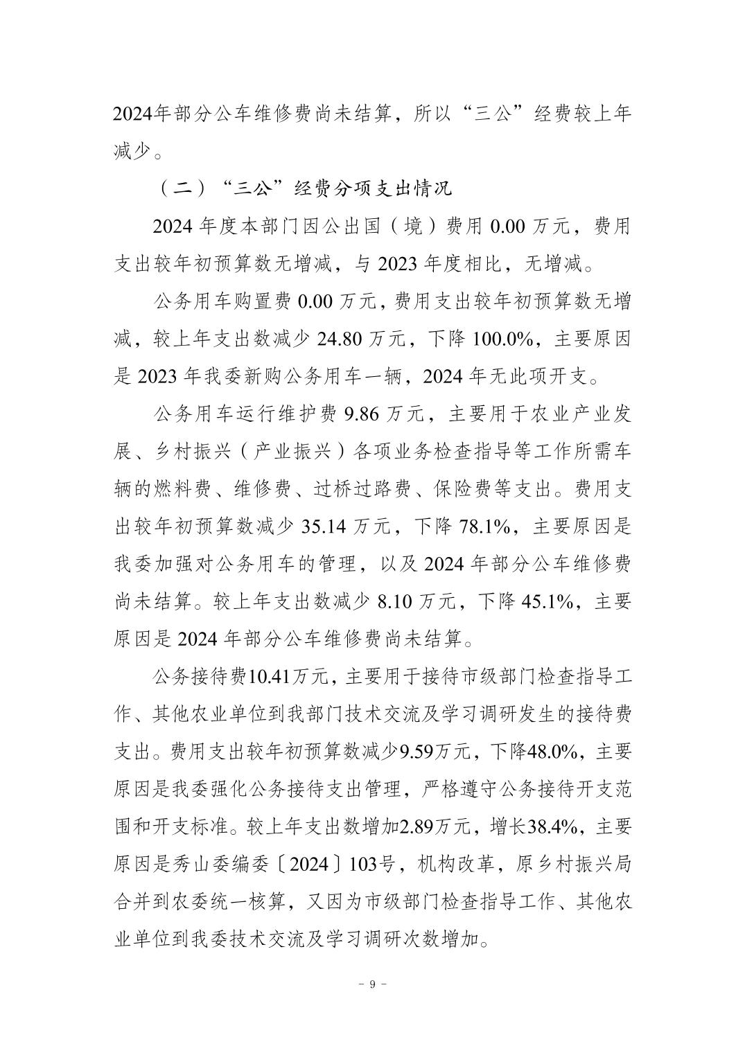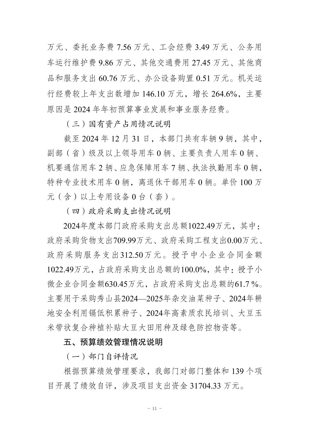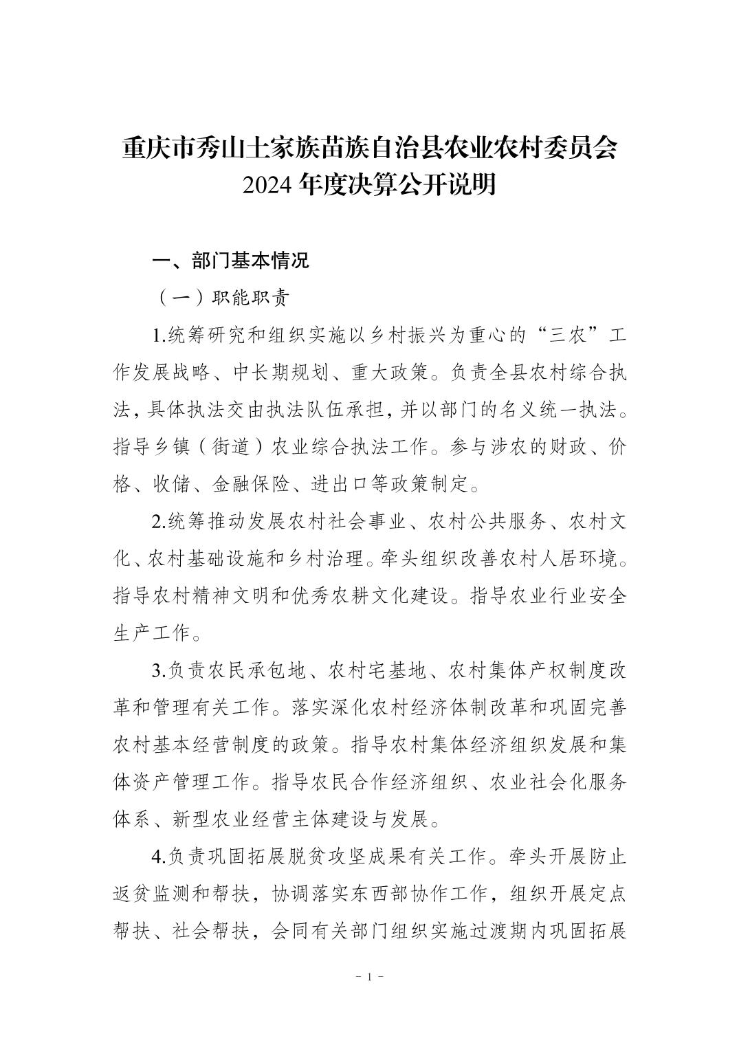 重庆市秀山土家族苗族自治县农业农村委员会2024年度决算公开说明