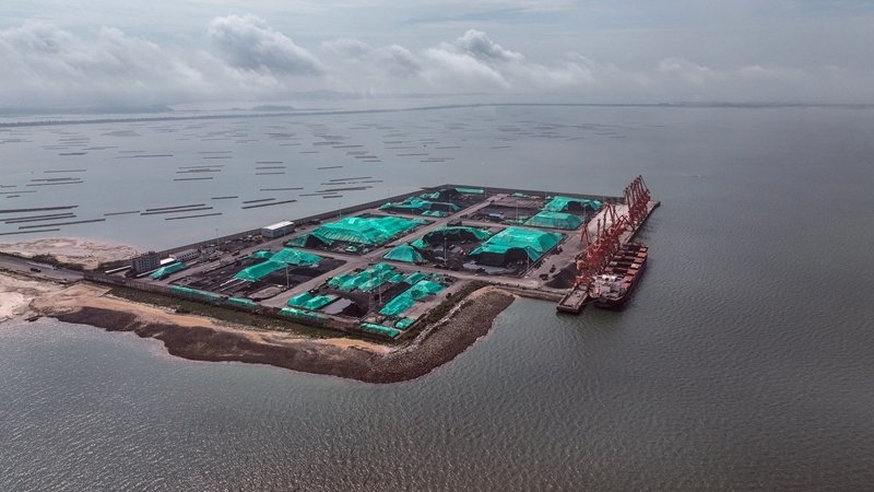5月18日,一艘海轮在钦州港散货码头下卸货物(无人机照片) 。
