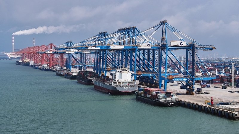 5月18日,三艘海轮在钦州港自动化码头下卸集装箱(无人机照片)。