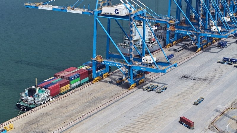 5月18日,一艘海轮在钦州港自动化码头下卸集装箱,智能小车在及时转运集装箱(无人机照片)。