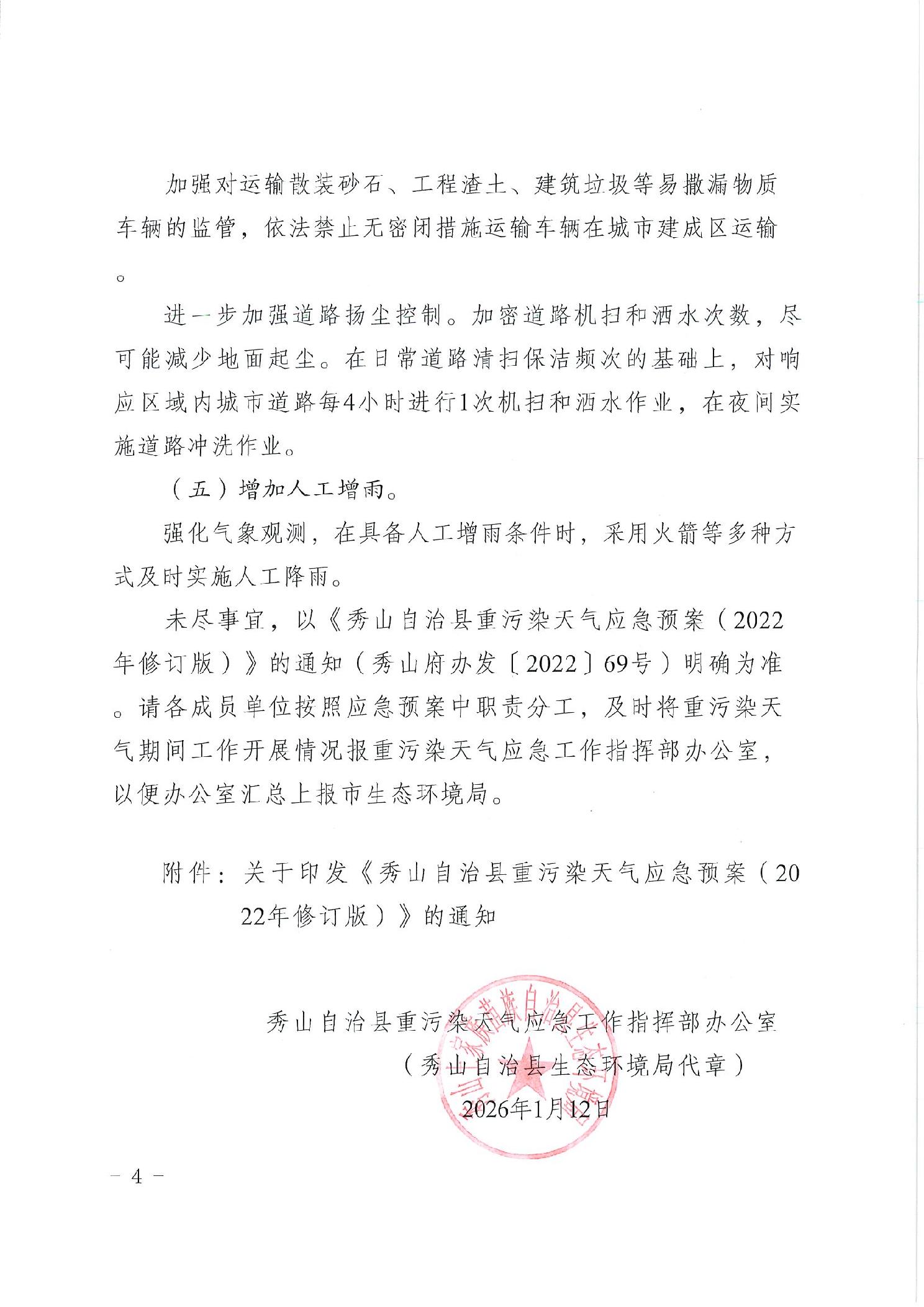 秀山自治县重污染天气应急工作指挥部办公室关于启动秀山自治县2026年第一次重污染天气黄色预警的通知