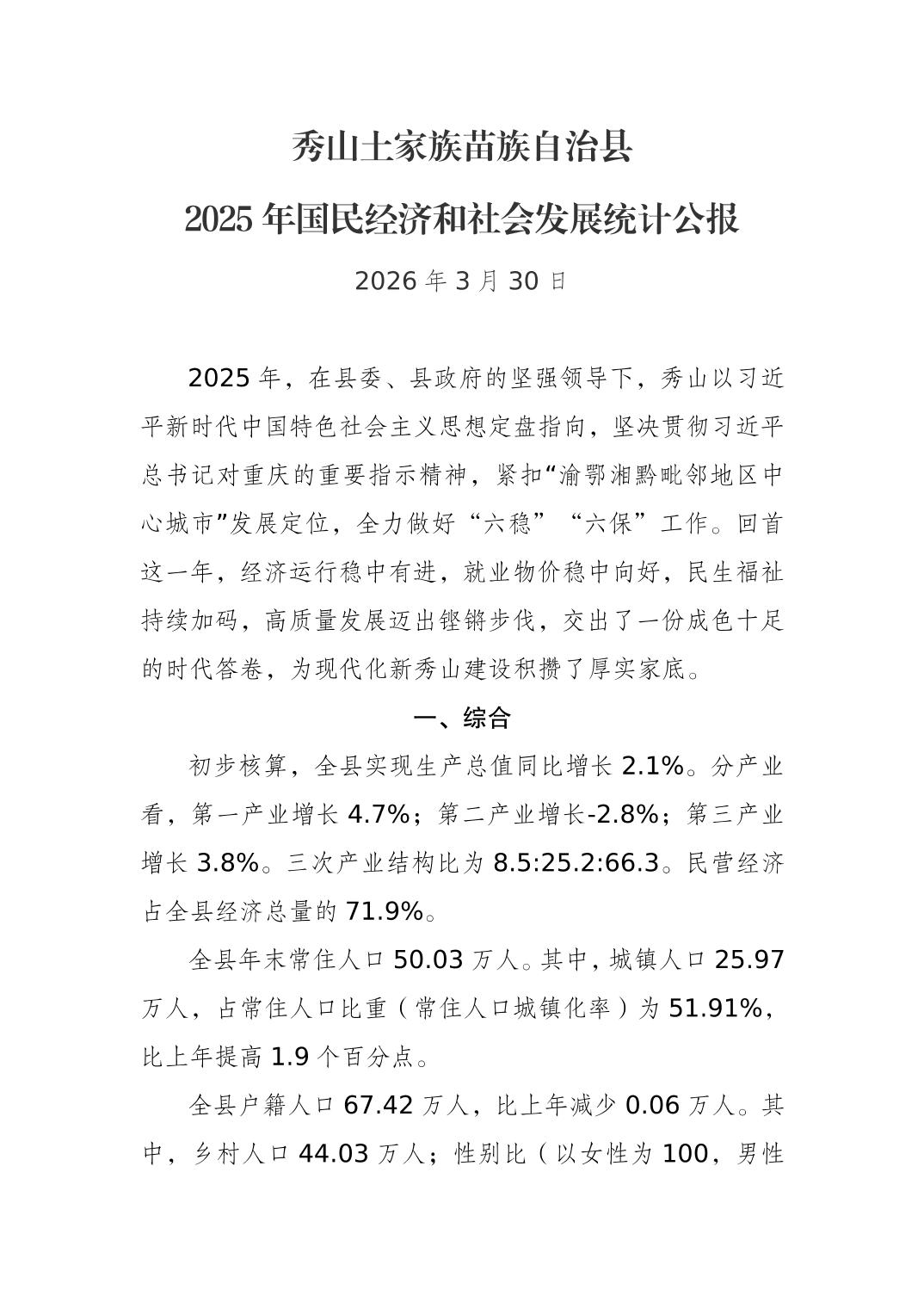 秀山土家族苗族自治县2025年国民经济和社会发展统计公报