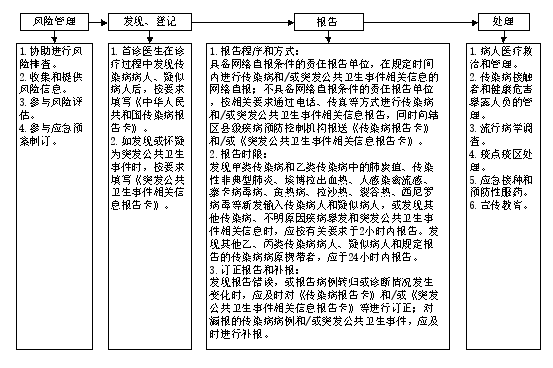 (一)乡镇卫生院、村卫生室和社区卫生服务中心(站)应按照《中华人民共和国传染病防治法》、《突发公共卫生事件应急条例》、《国家突发公共卫生事件应急预案》等法律法规要求,建立健全传染病和突发公共卫生事件报告管理制度,协助开展传染病和突发公共卫生事件的报告和处置。