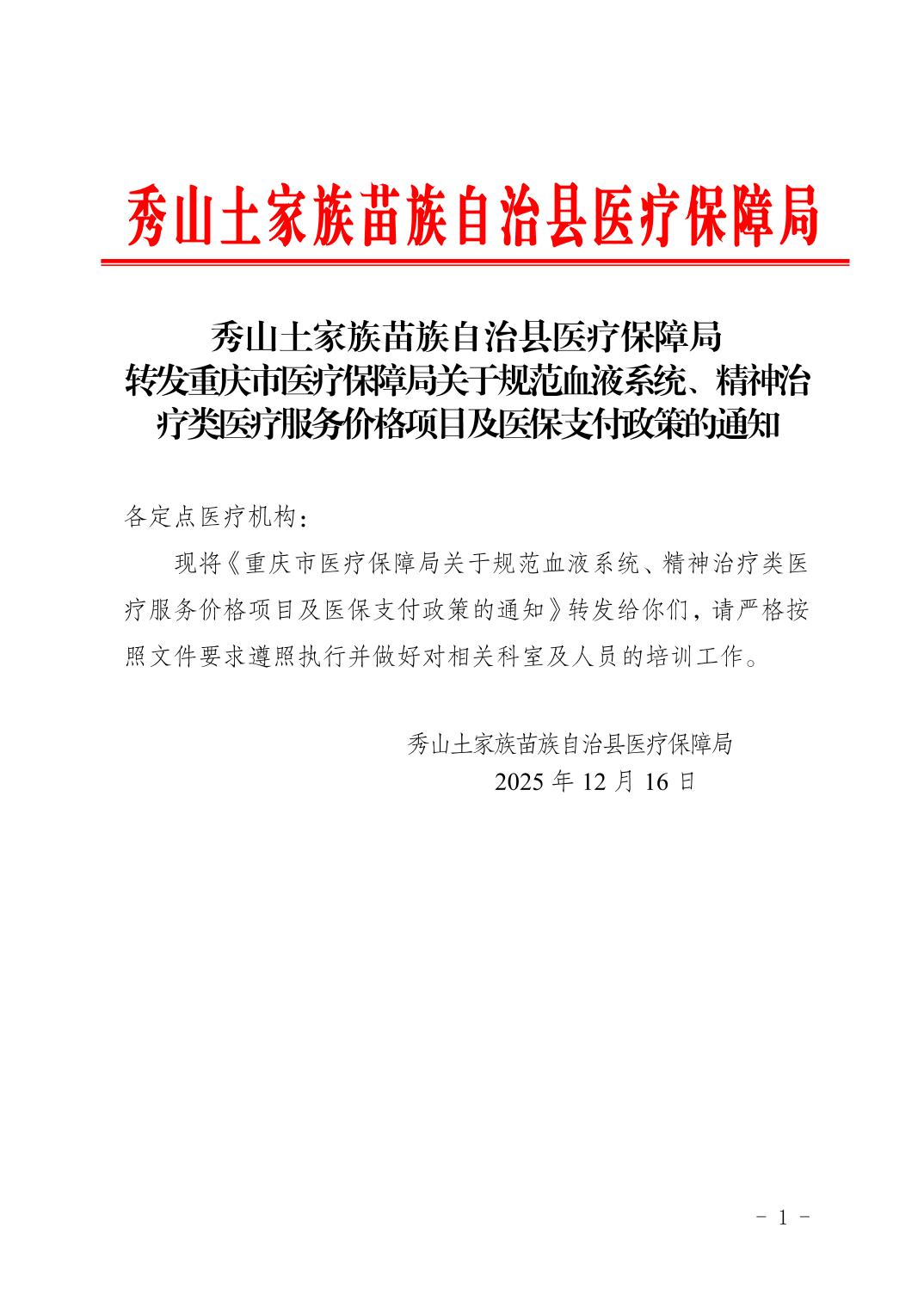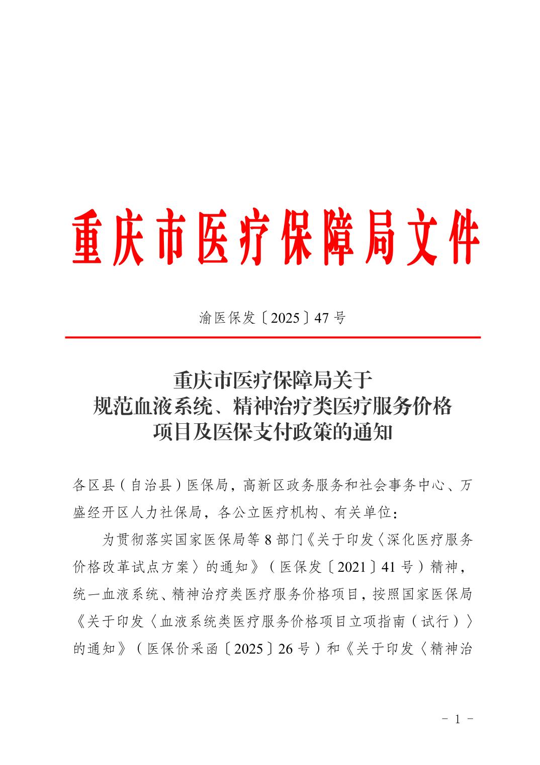 转发重庆市医疗保障局关于规范血液系统、精神治疗类医疗服务价格项目及医保支付政策的通知