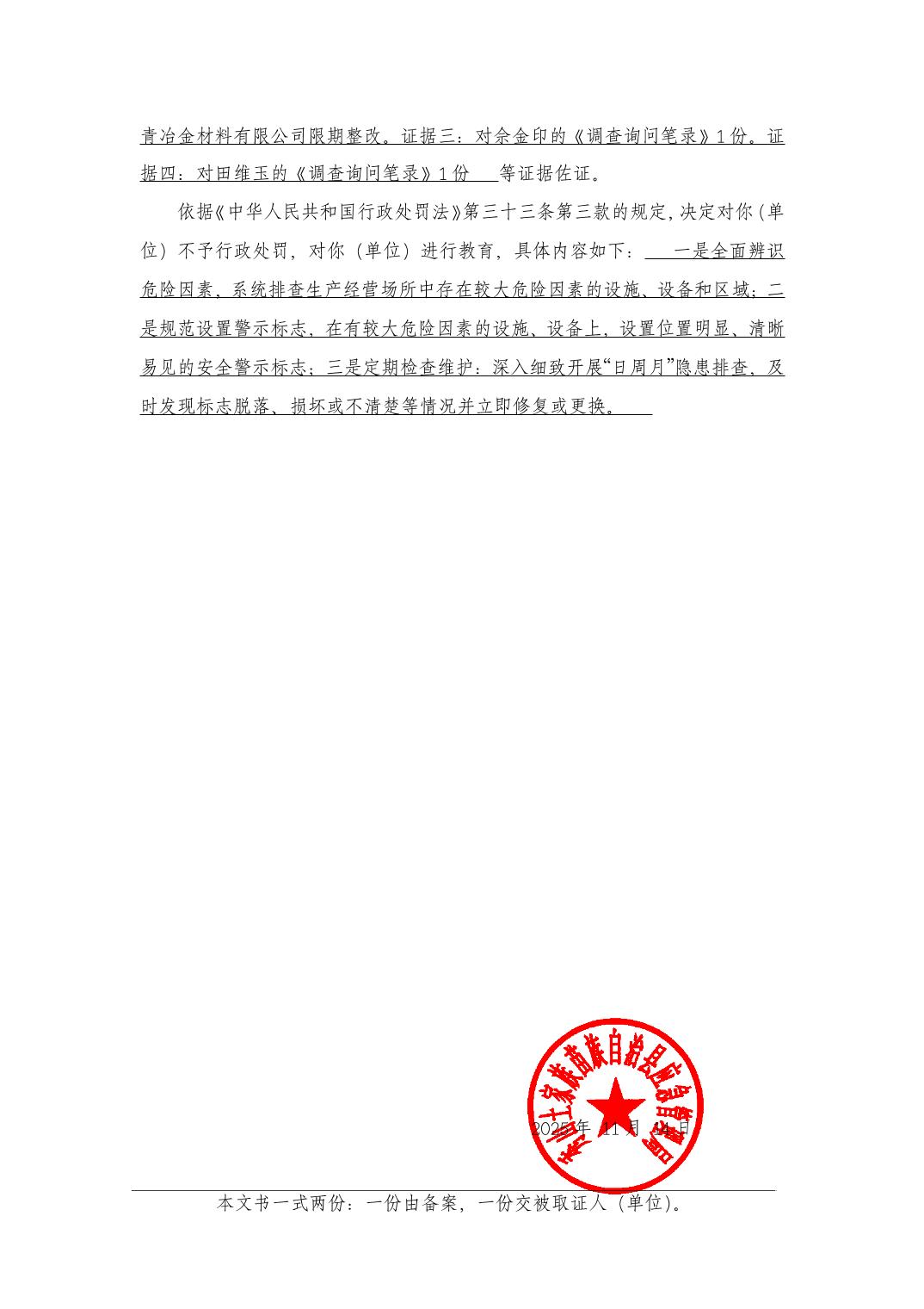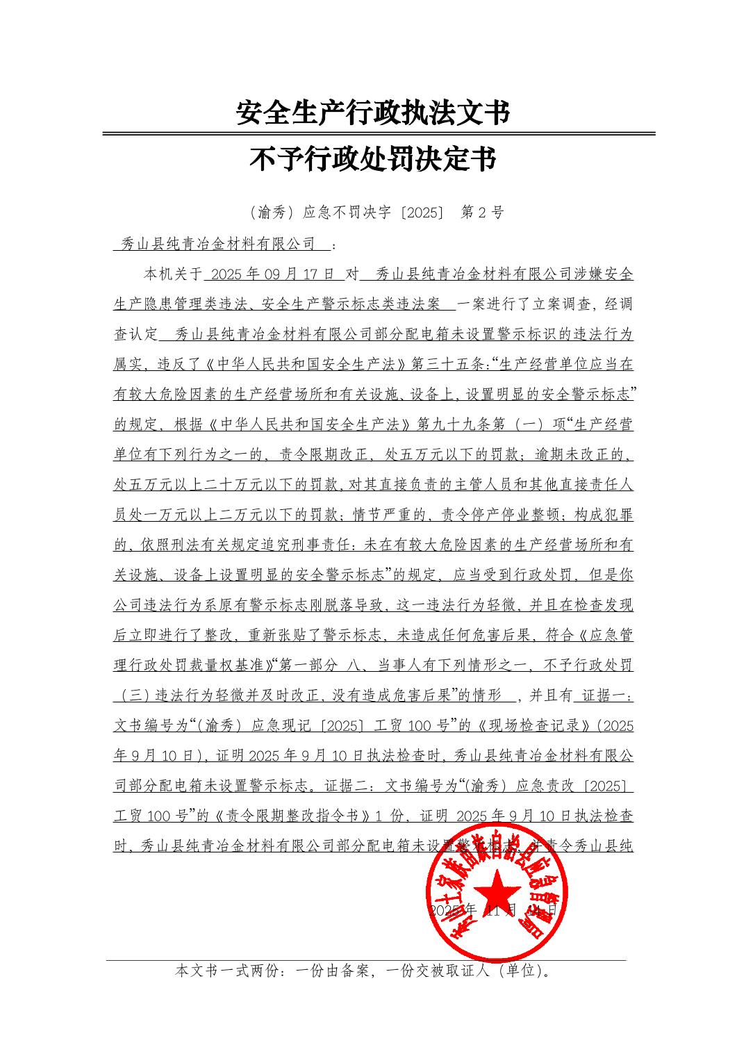(渝秀)应急不罚决字〔2025〕 第 2 号 秀山县纯青冶金材料有限公司