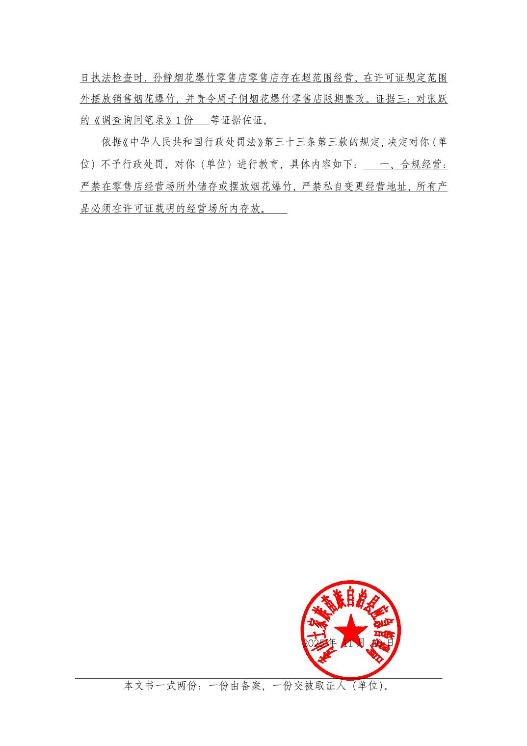 (渝秀)应急不罚决字〔2025〕 第 3 号 孙静烟花爆竹零售店