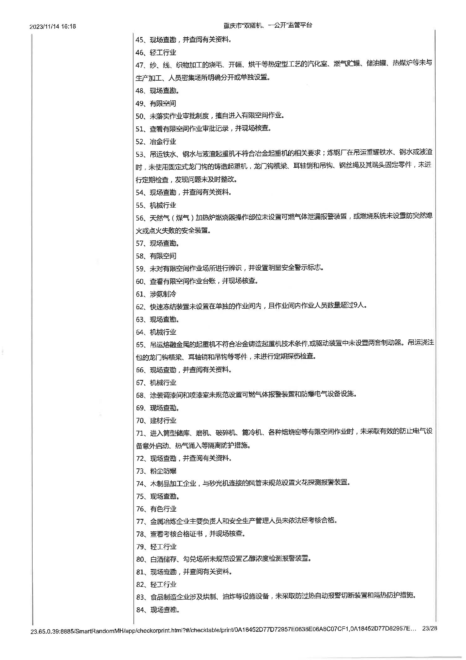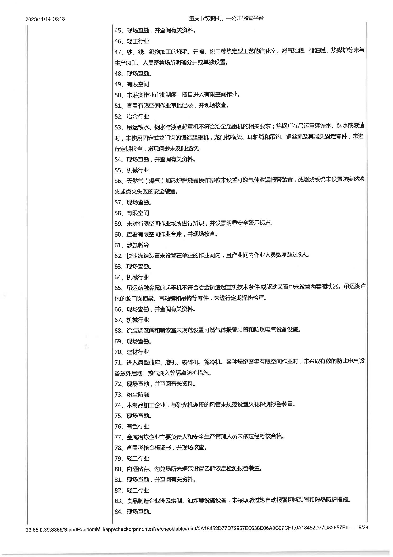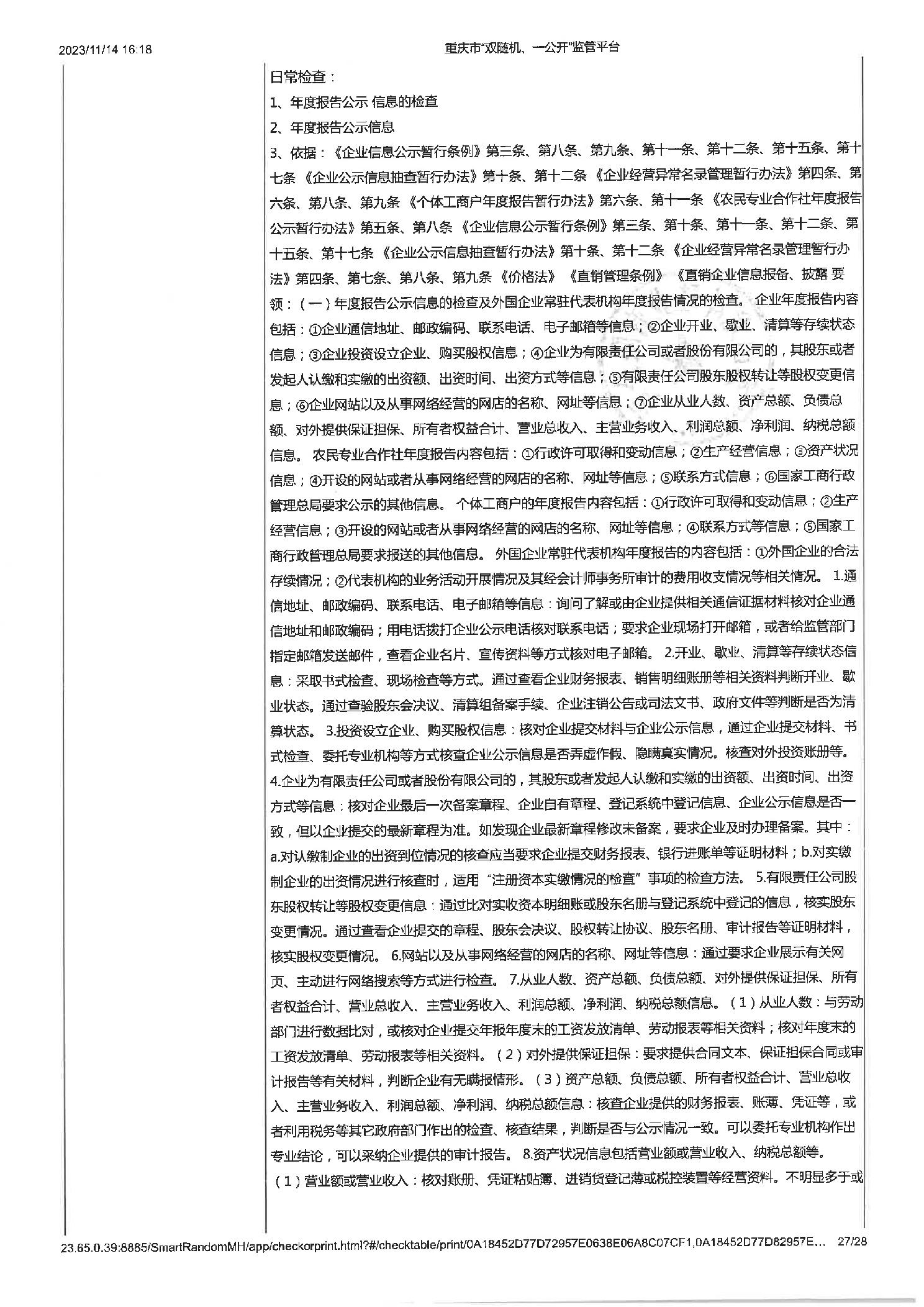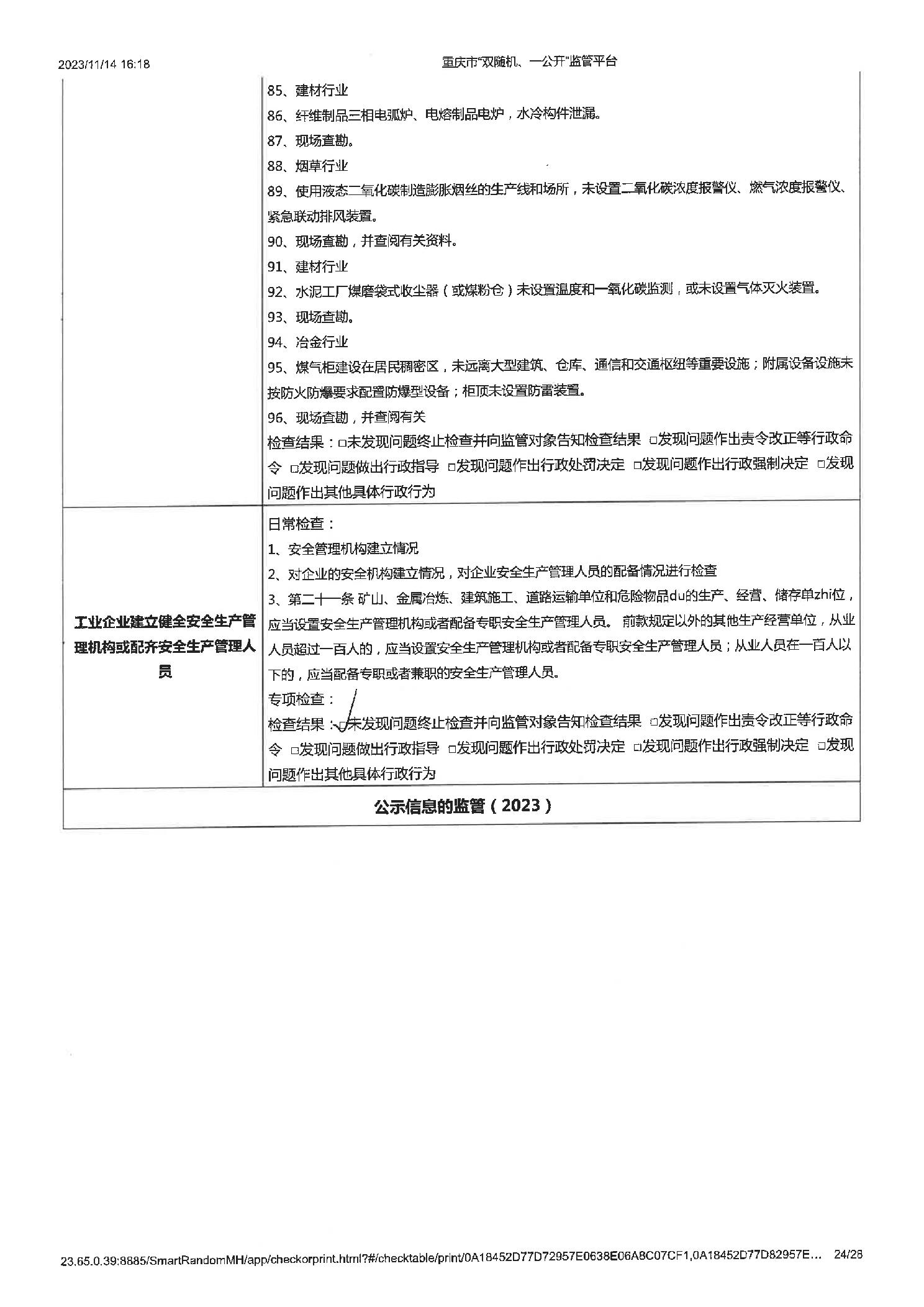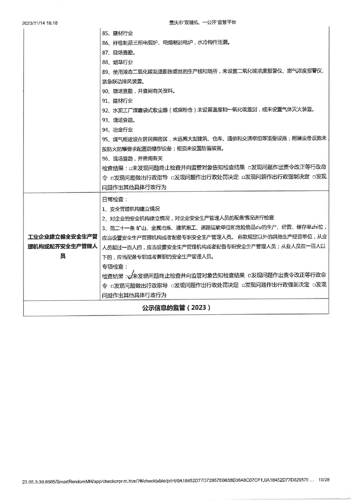 工业企业建立健全安全生茶制度并有效实施,工业企业建立健全安全生产管理机构或配齐安全生产管理人员,即使公示信息的检查,年度报告公示信息的检查 |