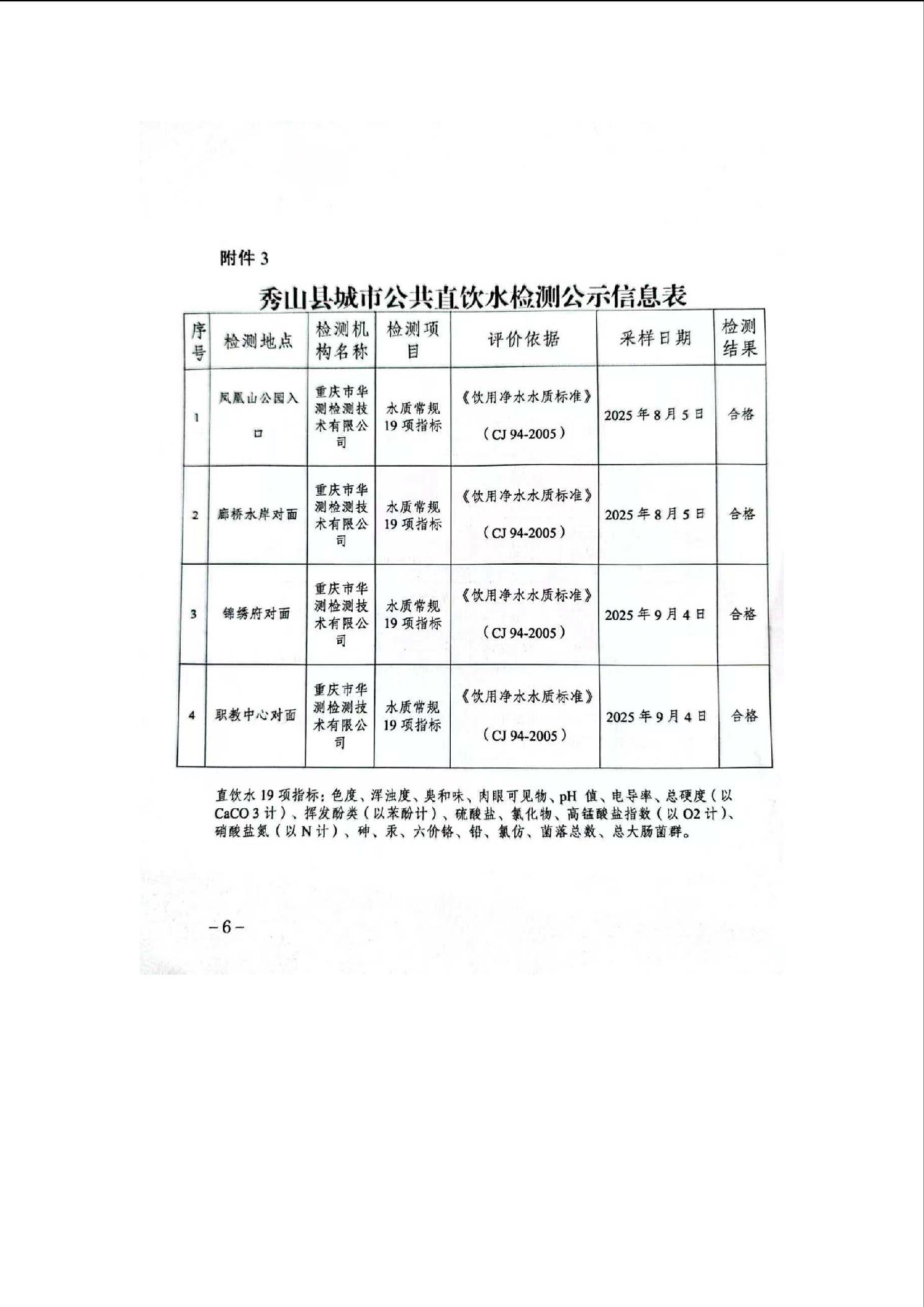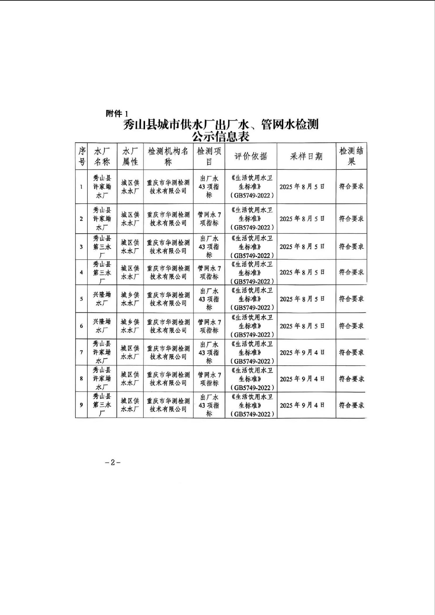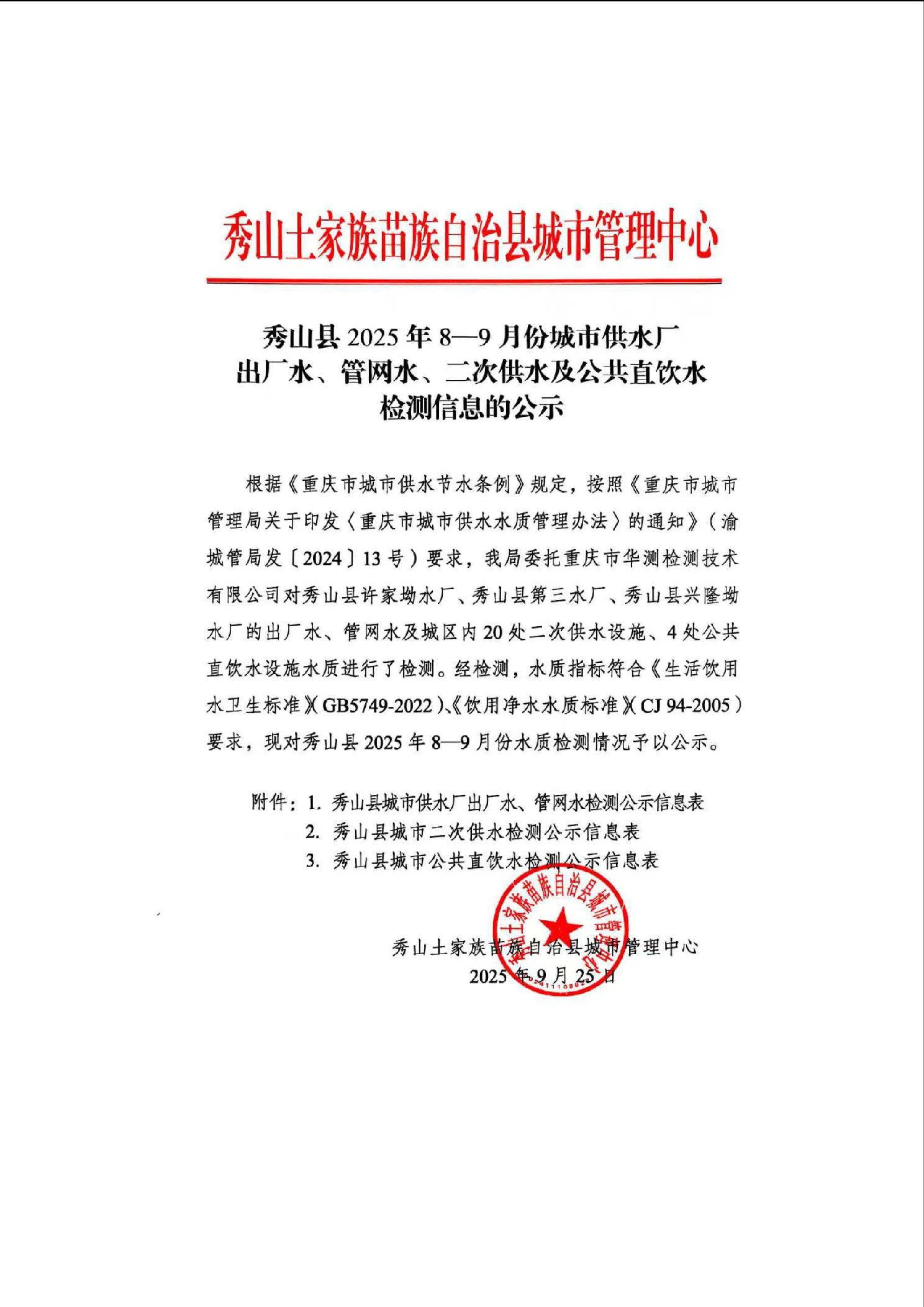 秀山县2025年8-9月份城市供水厂、出厂水、管网水二次供水及公共直饮水检测信息的公示