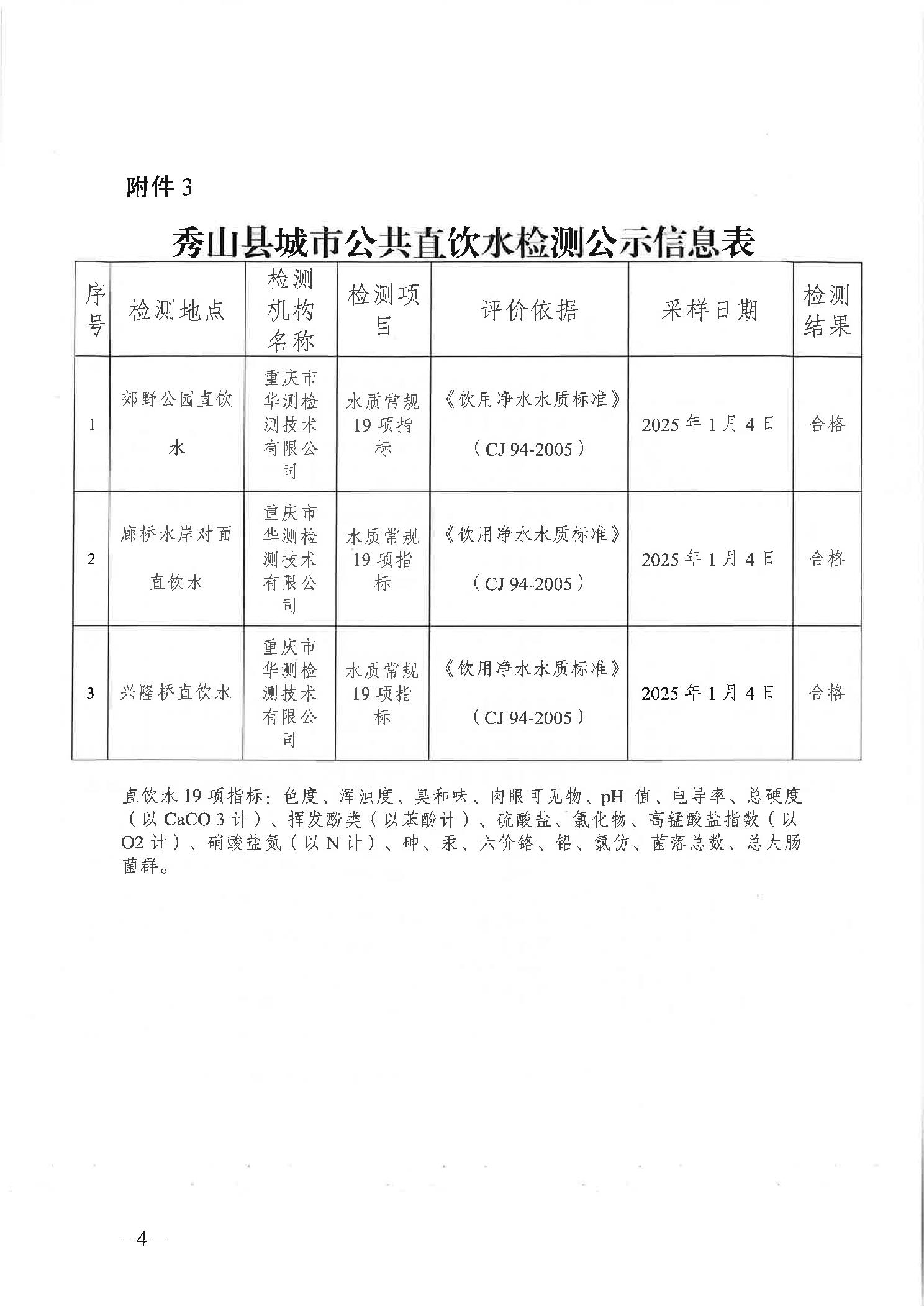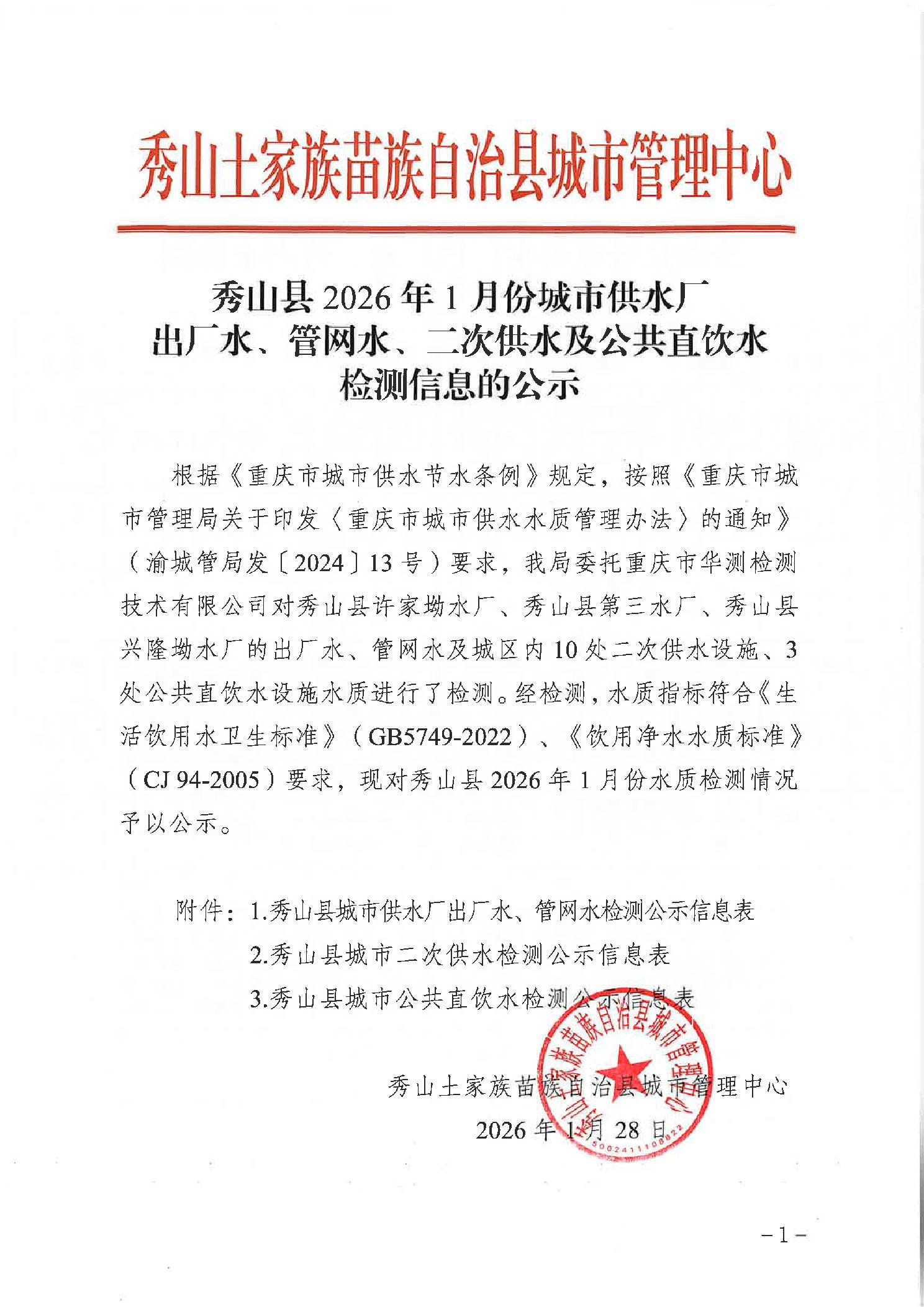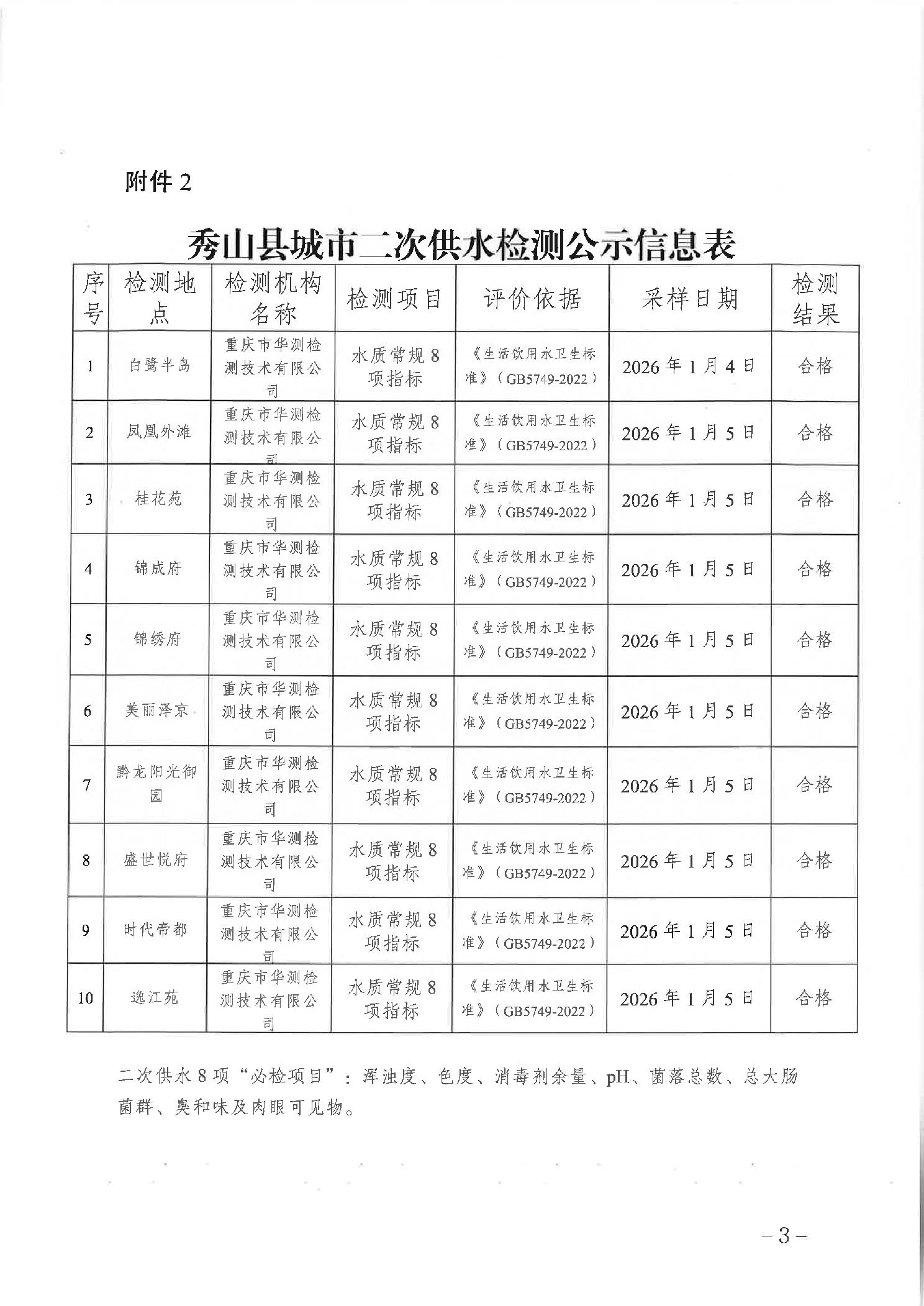 秀山县2026年1月份城市供水厂、出厂水、管网水二次供水及公共直饮水检测信息的公示