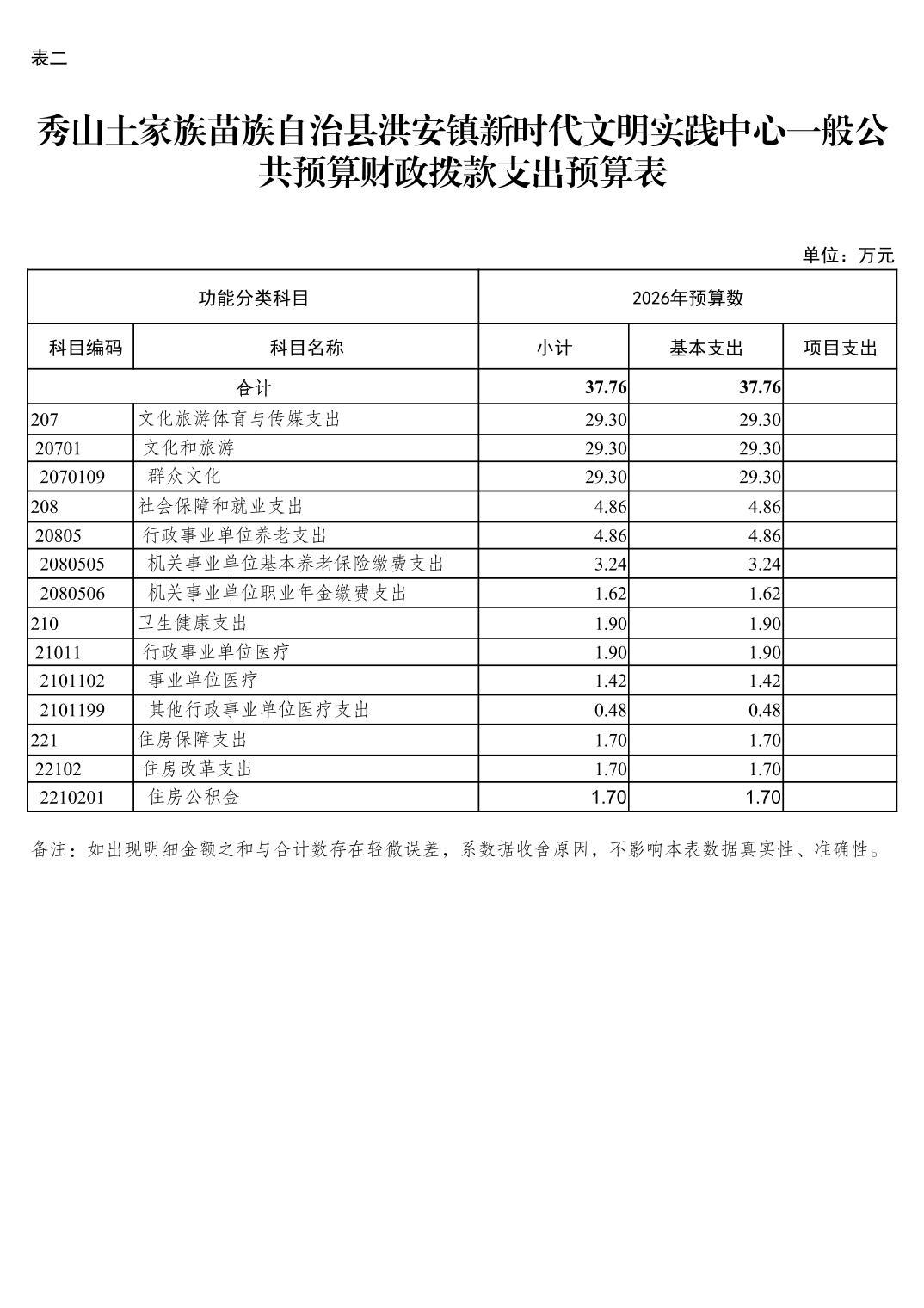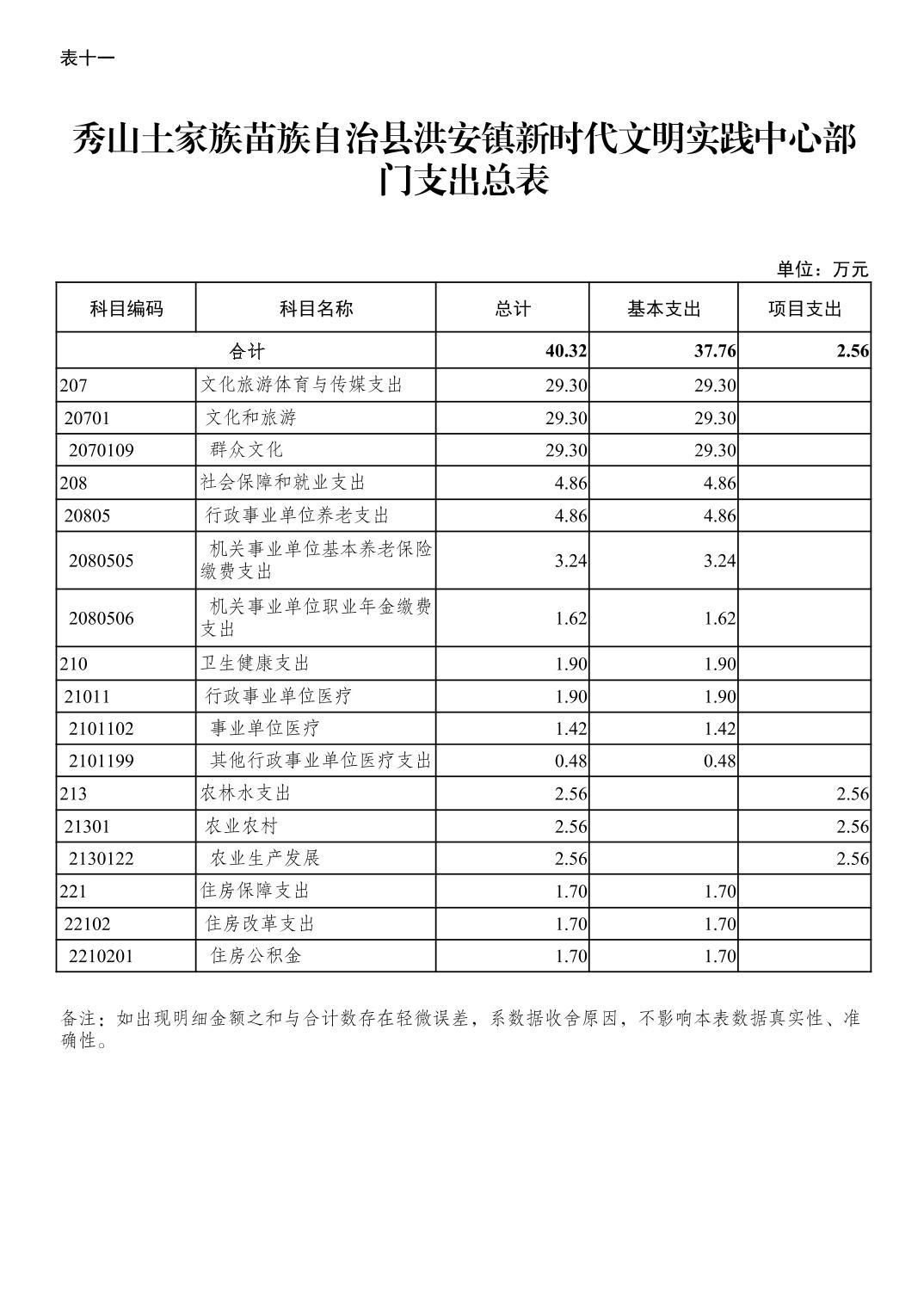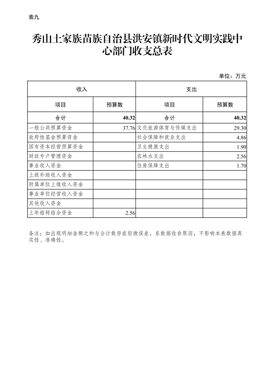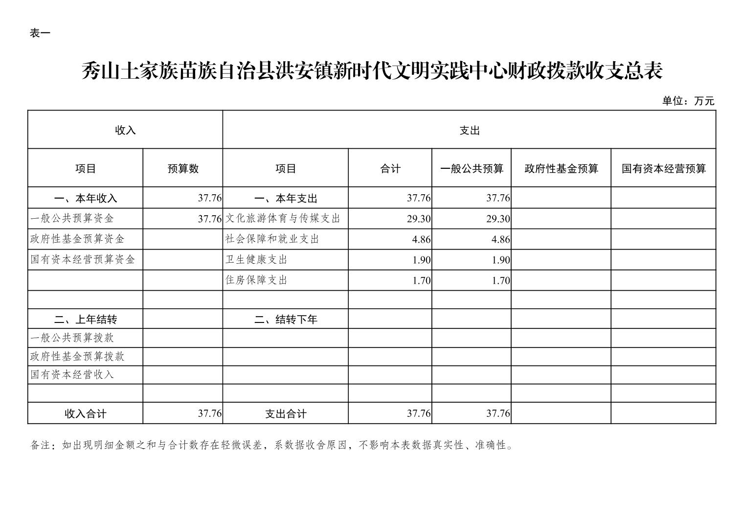 | 秀山土家族苗族自治县洪安镇新时代文明实践中心部门收支总表 | ||||