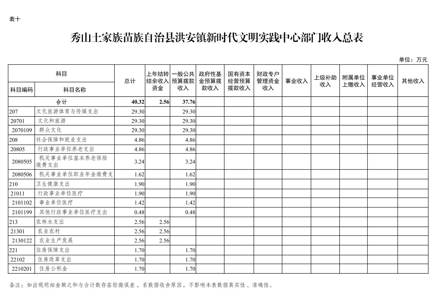 | 秀山土家族苗族自治县洪安镇新时代文明实践中心部门收入总表 | ||||||||||||