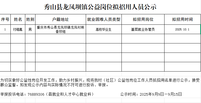 秀山县龙凤坝镇公益岗位拟招用人员公示