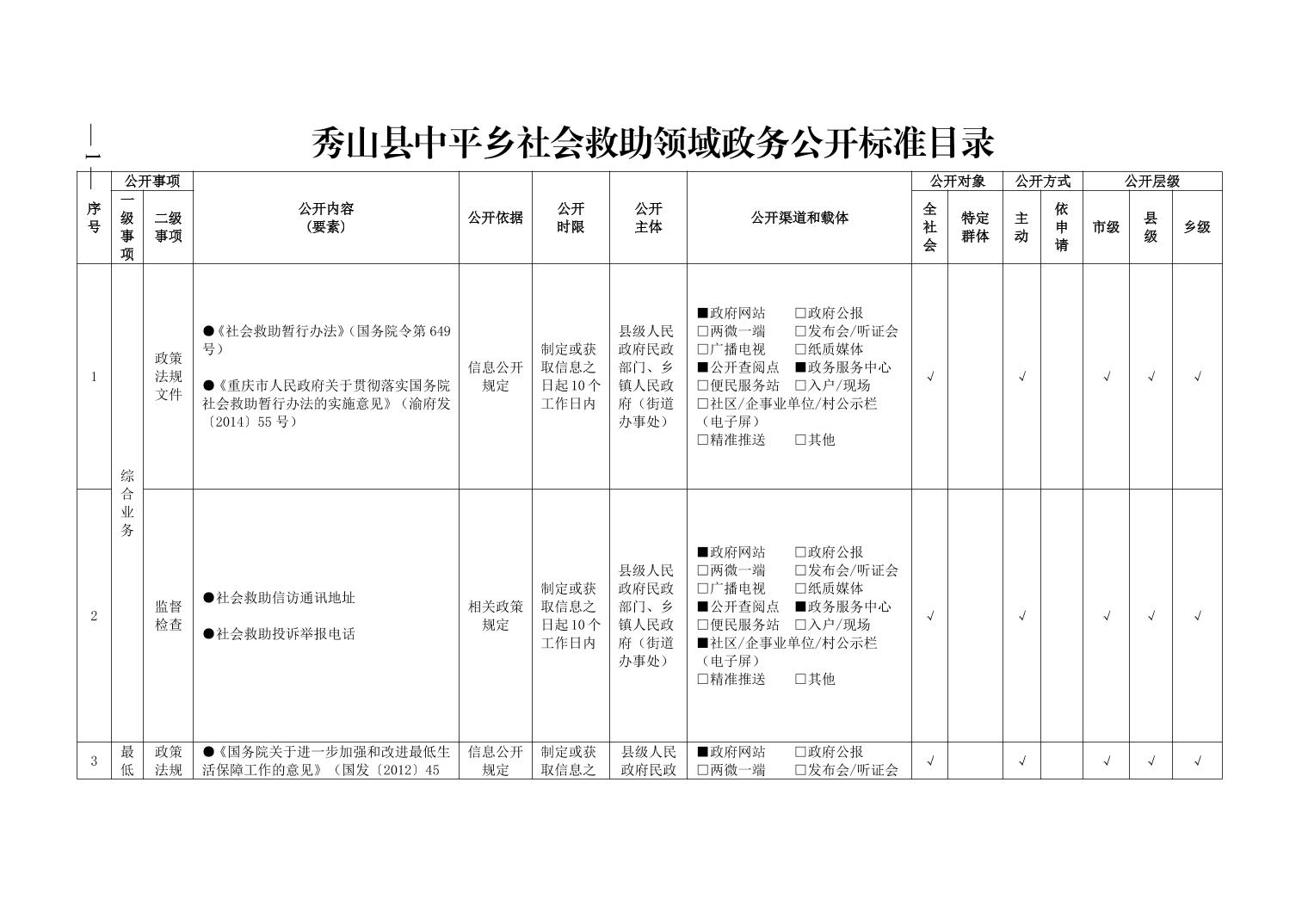 秀山县中平乡社会救助领域政务公开标准目录2026年版