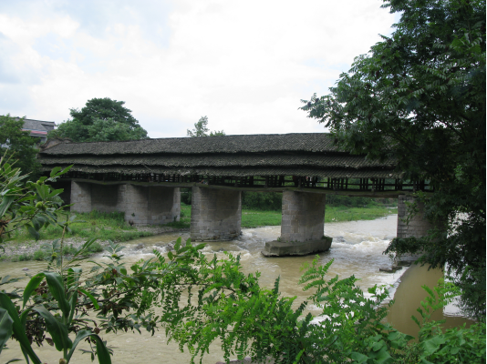 客寨桥位于秀山清溪场镇司城村中寨组客寨,横跨平江河,古名“钟灵桥”,习惯称客寨桥。市级文物保护单位,始建于元代,因年代久远,多次毁损,历代均不断重修或维修。清光绪建长廊及亭廊,1960年亭廊拆除。现为清末民初建筑,长廊式石礅木结构三重檐(迎水方二重檐)风雨桥。7墩6跨21间,桥长57米,通高18米,桥面宽5米。桥两头为砖砌山墙,小青瓦盖顶,两边踏道各7—10级。该桥独具土家族风格和民族特色,是目前渝东南地区尚存不多的古桥梁建筑之一,具有重要的历史、艺术和科学价值。