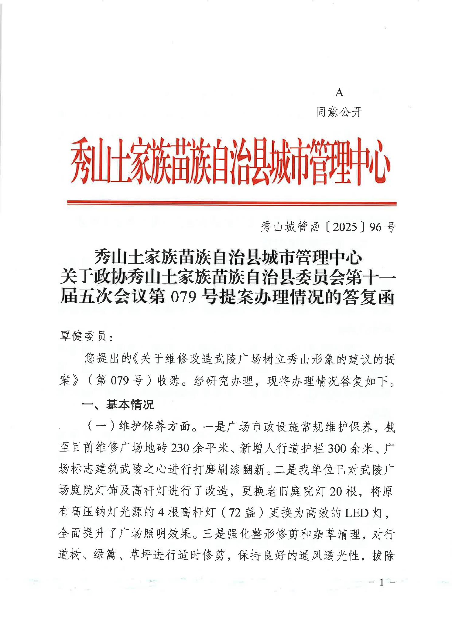 秀山土家族苗族自治县城市管理中心 关于政协秀山土家族苗族自治县委员会第十一届五次会议第079号提案办理情况的答复函