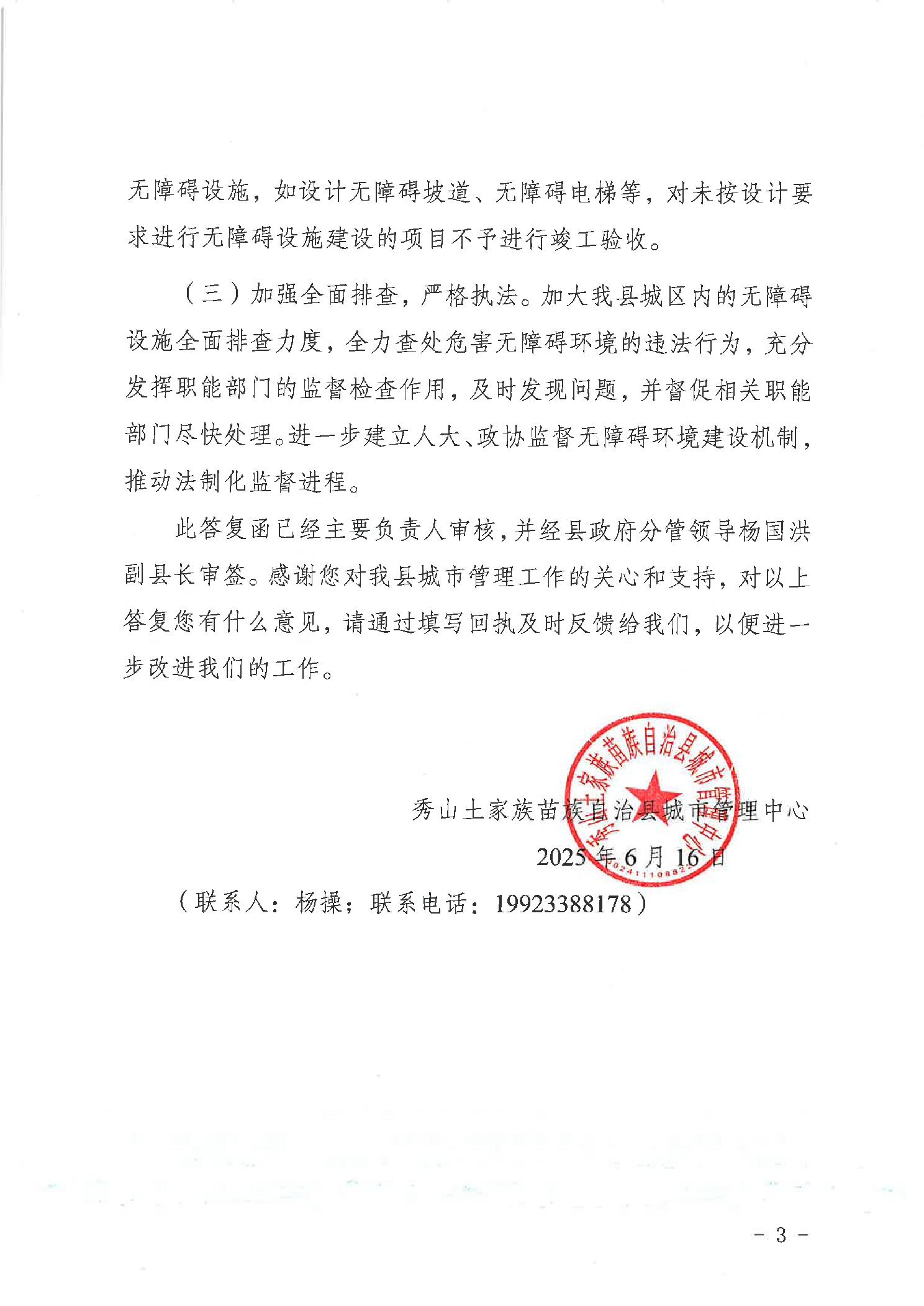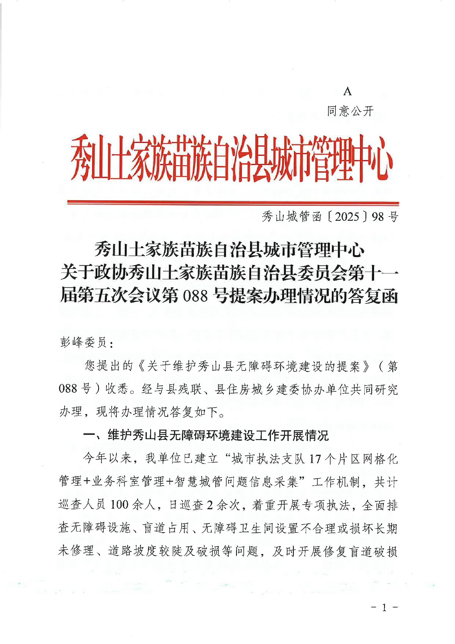 秀山土家族苗族自治县城市管理中心 关于政协秀山土家族苗族自治县委员会第十一届第五次会议第088号提案办理情况的答复函
