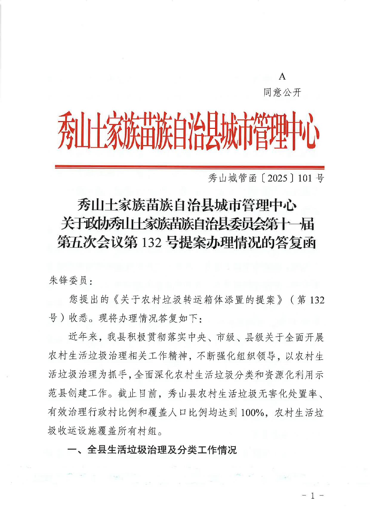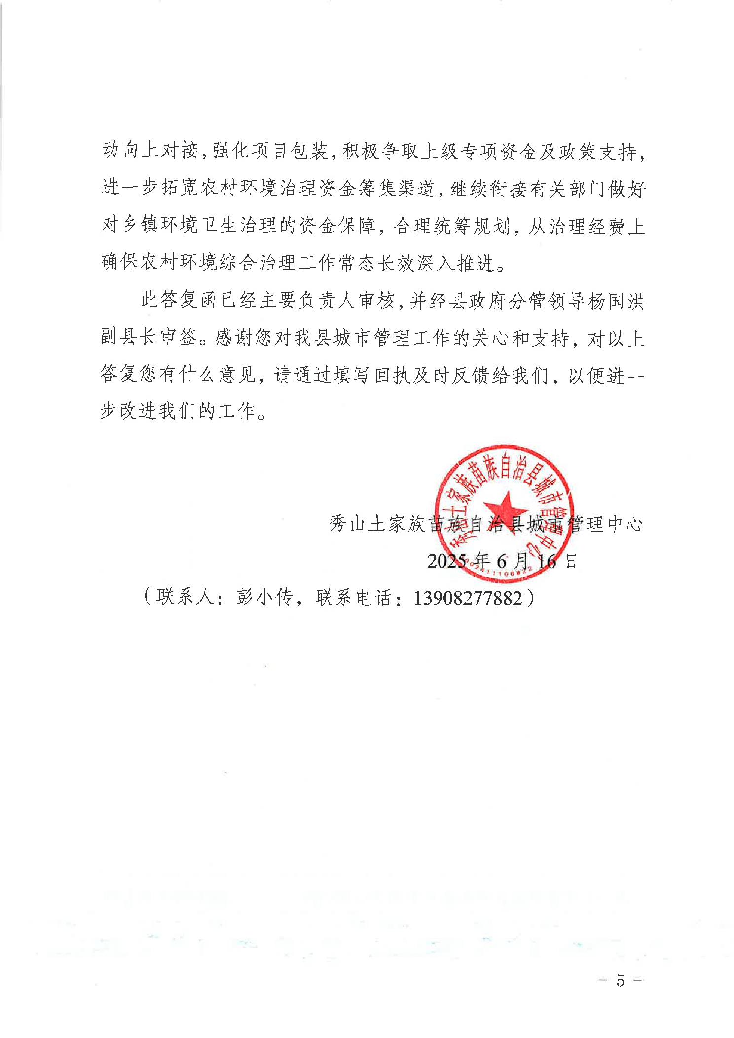 秀山土家族苗族自治县城市管理中心 关于政协秀山土家族苗族自治县委员会第十一届 第五次会议第132号提案办理情况的答复函