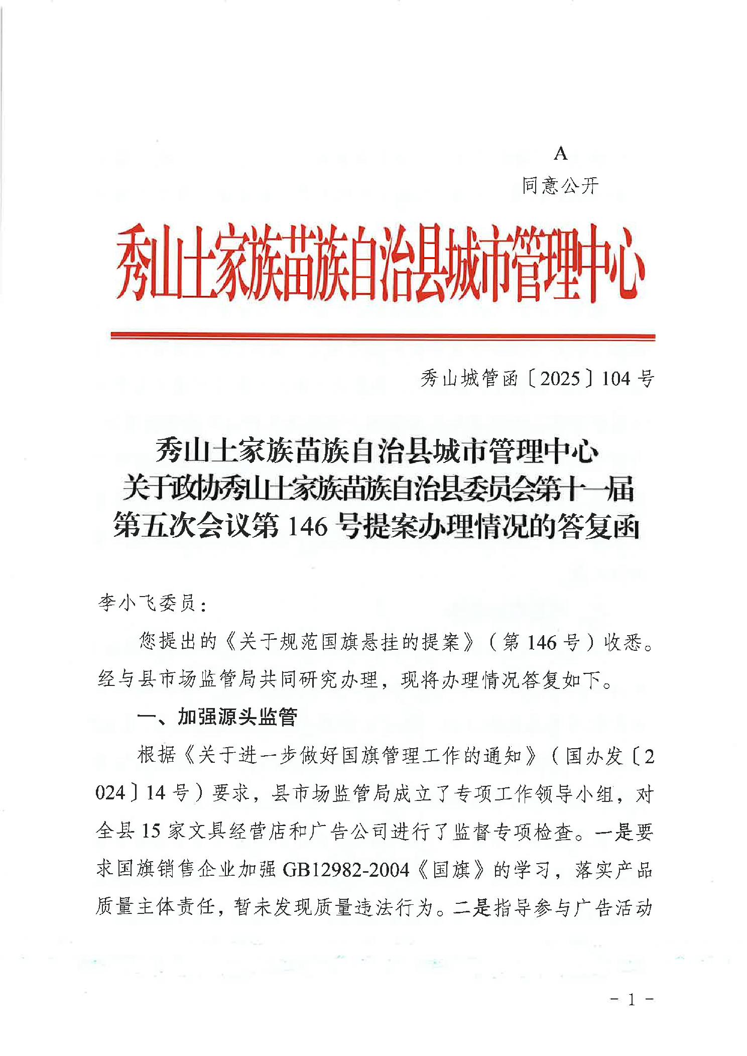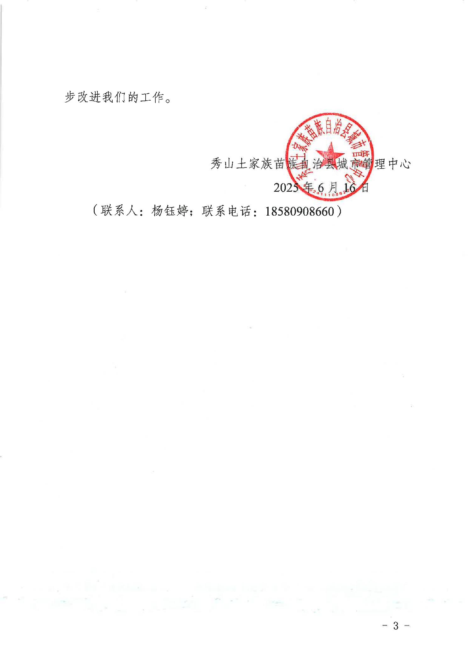 秀山土家族苗族自治县城市管理中心 关于政协秀山土家族苗族自治县委员会第十一届 第五次会议第146号提案办理情况的答复函