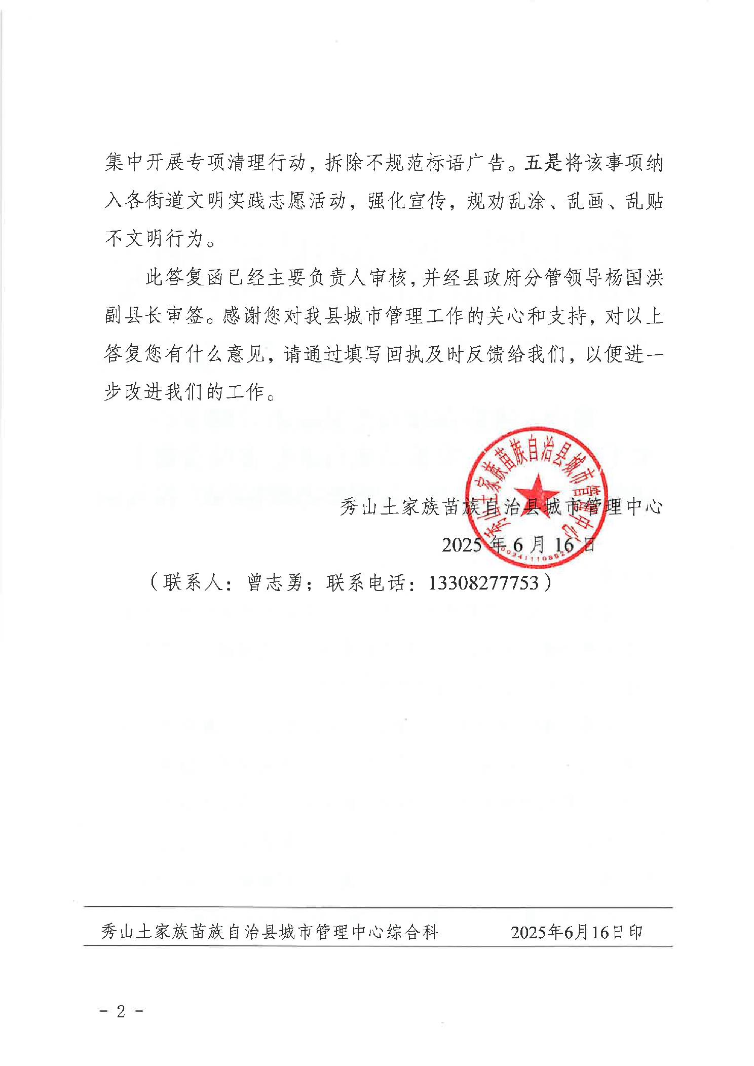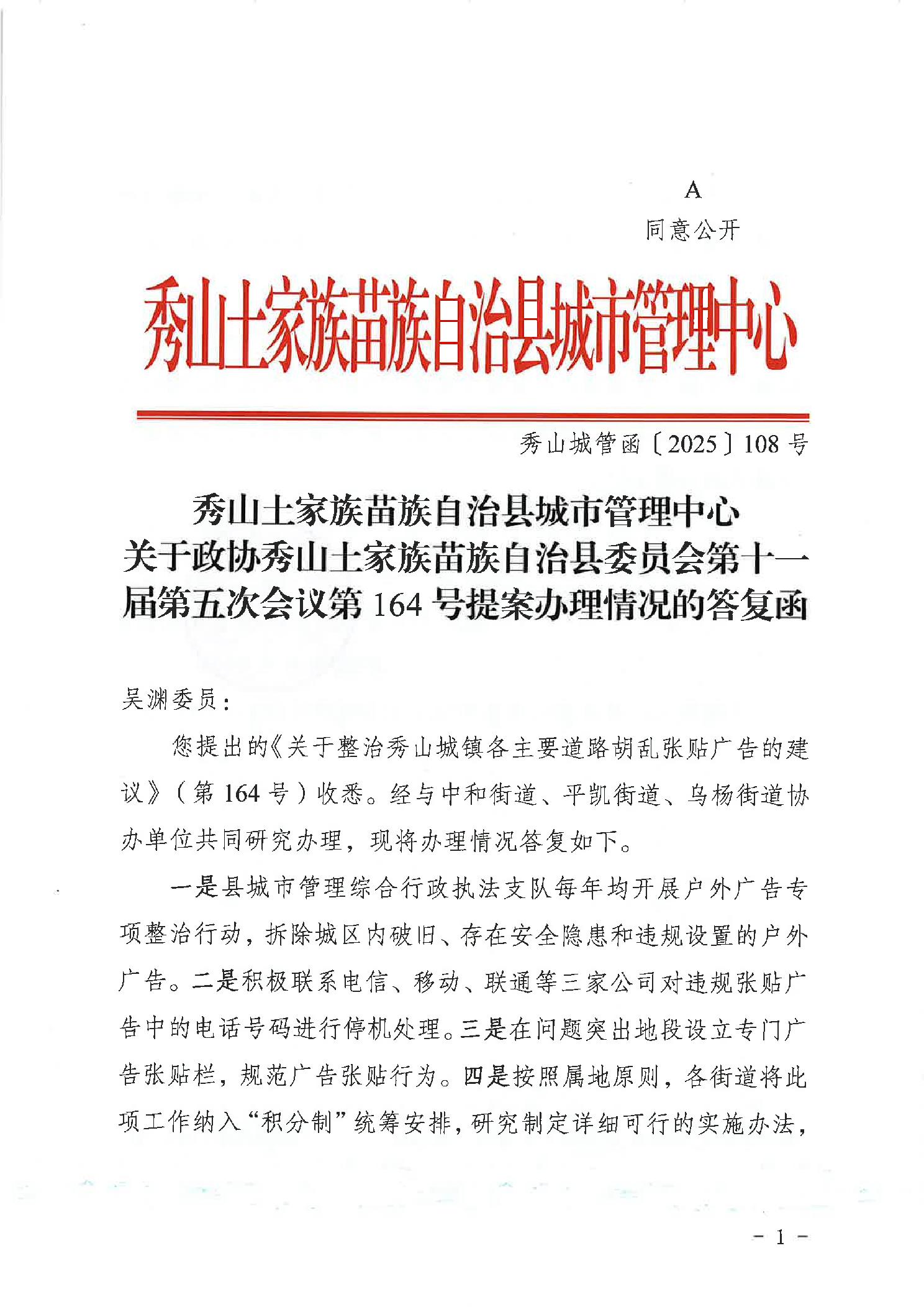 秀山土家族苗族自治县城市管理中心 关于政协秀山土家族苗族自治县委员会第十一届第五次会议第164号提案办理情况的答复函